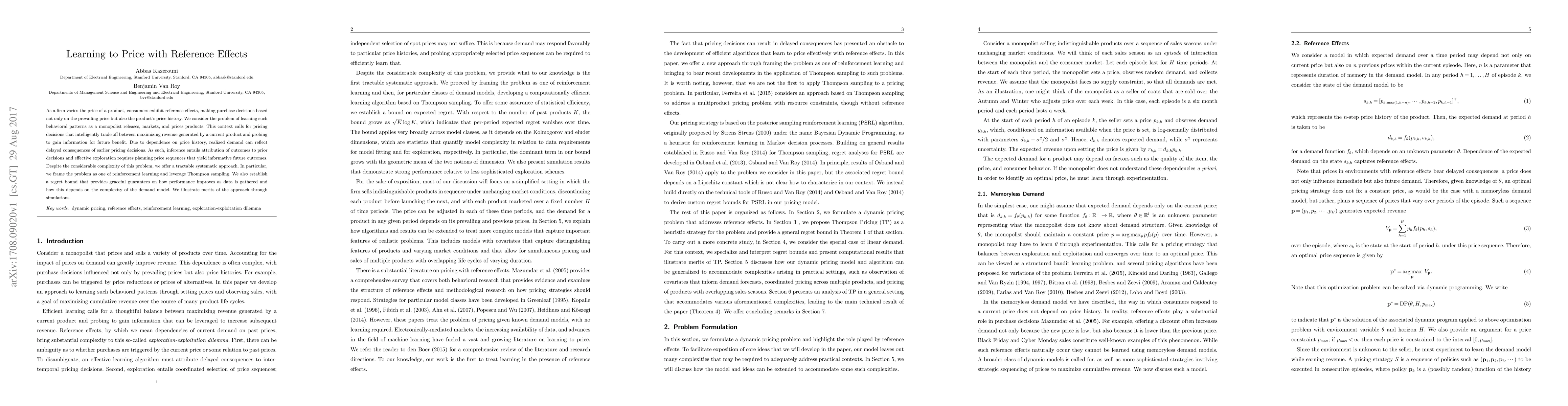 A research paper proposes a systematic approach to pricing products with reference effects in mind, using reinforcement learning and Thompson sampling to optimize revenue while gathering information about demand patterns. The approach offers regret bounds that provide guarantees on performance improvement as data is collected.