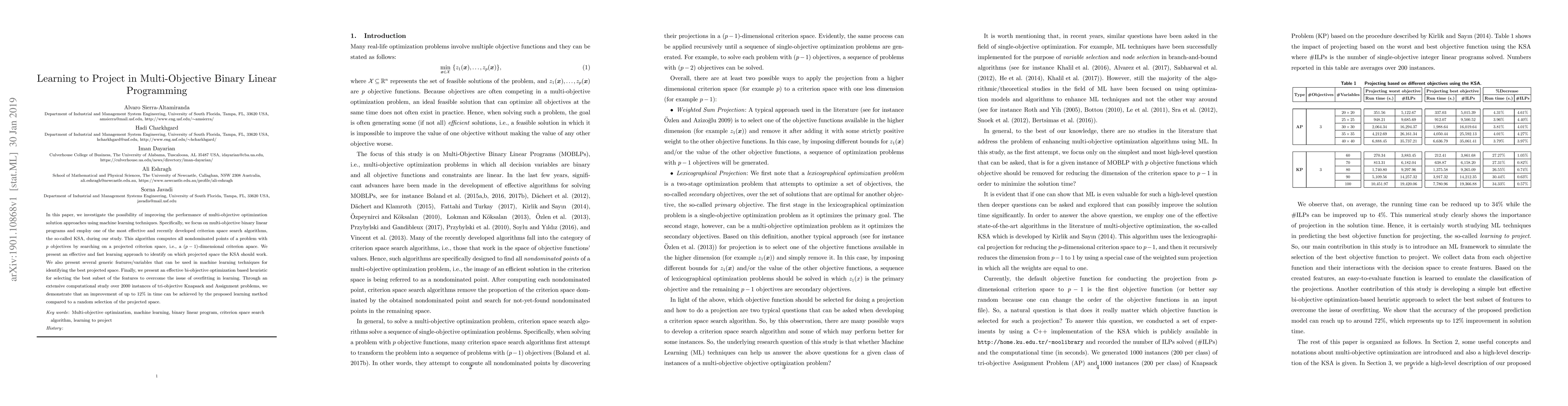In this paper, we investigate the possibility of improving the performance of multi-objective optimization solution approaches using machine learning techniques. Specifically, we focus on multi-objective binary linear programs and employ one of the most effective and recently developed criterion space search algorithms, the so-called KSA, during our study. This algorithm computes all nondominated points of a problem with p objectives by searching on a projected criterion space, i.e., a (p-1)-dimensional criterion apace. We present an effective and fast learning approach to identify on which projected space the KSA should work. We also present several generic features/variables that can be used in machine learning techniques for identifying the best projected space. Finally, we present an effective bi-objective optimization based heuristic for selecting the best subset of the features to overcome the issue of overfitting in learning. Through an extensive computational study over 2000 instances of tri-objective Knapsack and Assignment problems, we demonstrate that an improvement of up to 12% in time can be achieved by the proposed learning method compared to a random selection of the projected space.