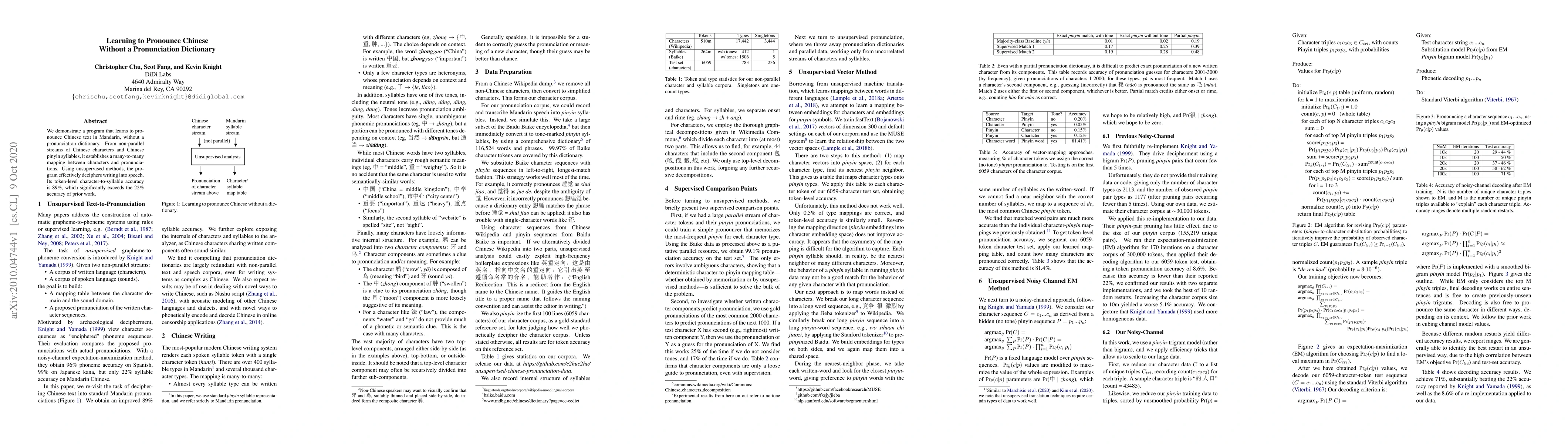 We demonstrate a program that learns to pronounce Chinese text in Mandarin, without a pronunciation dictionary. From non-parallel streams of Chinese characters and Chinese pinyin syllables, it establishes a many-to-many mapping between characters and pronunciations. Using unsupervised methods, the program effectively deciphers writing into speech. Its token-level character-to-syllable accuracy is 89%, which significantly exceeds the 22% accuracy of prior work.