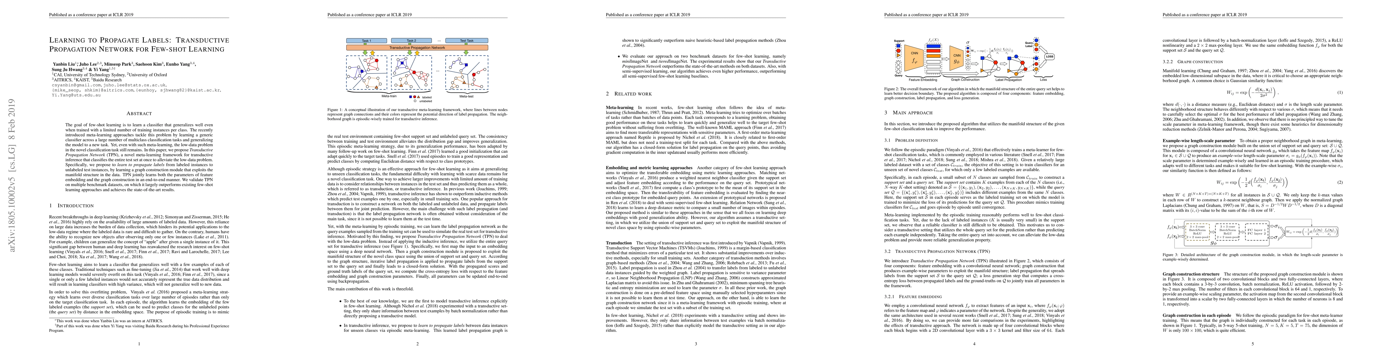 This paper introduces Transductive Propagation Network (TPN), a meta-learning framework for few-shot learning that addresses the low-data problem by classifying the entire test set simultaneously. TPN learns to propagate labels from labeled to unlabeled instances using a graph construction module, achieving state-of-the-art results on benchmark datasets.
