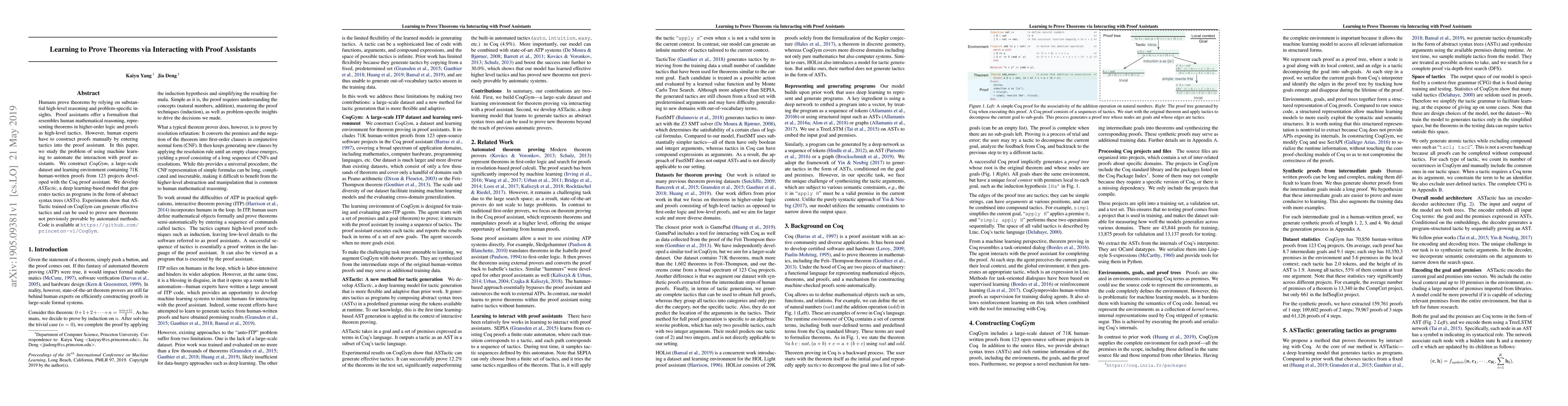 This paper explores using machine learning to automate interactions with proof assistants, introducing CoqGym, a dataset of 71K proofs from Coq projects. It presents ASTactic, a deep learning model generating tactics as abstract syntax trees, which can prove new theorems beyond automated methods.