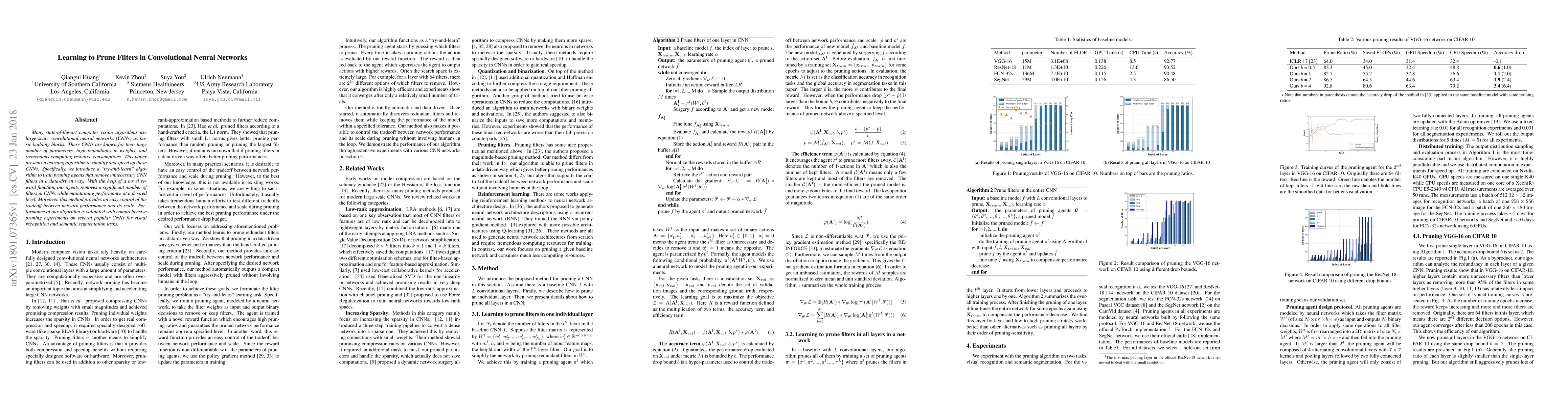 This paper proposes a learning algorithm to prune unnecessary filters in convolutional neural networks (CNNs) using a "try-and-learn" approach, enabling significant reduction in network size while maintaining performance. The method employs a novel reward function to balance performance and network scale, validated through experiments on various CNNs for visual recognition and semantic segmentation.