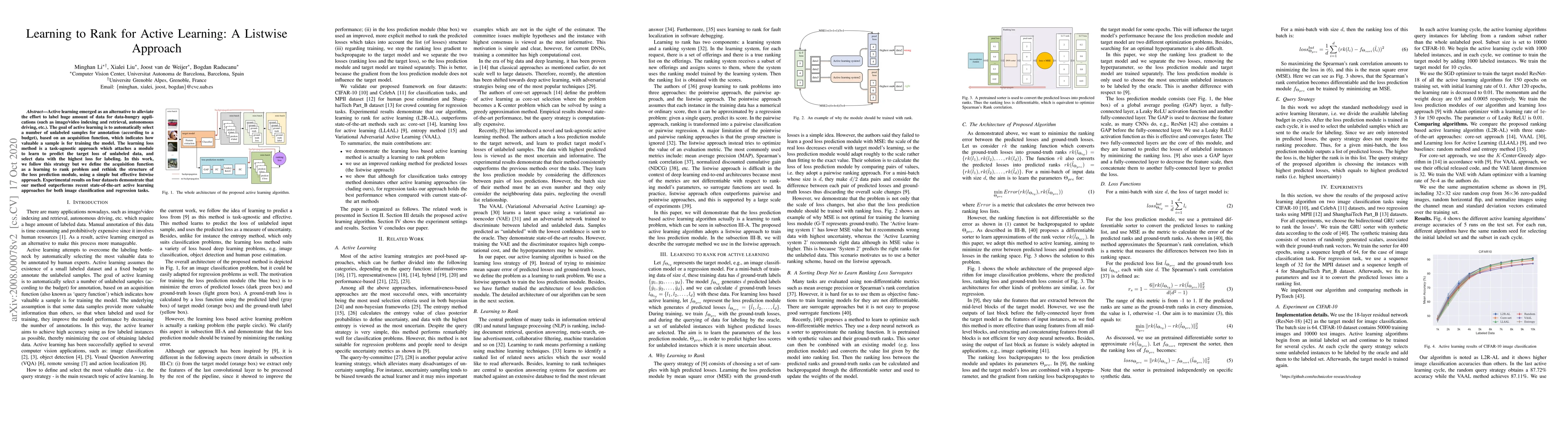 Active learning emerged as an alternative to alleviate the effort to label huge amount of data for data hungry applications (such as image/video indexing and retrieval, autonomous driving, etc.). The goal of active learning is to automatically select a number of unlabeled samples for annotation (according to a budget), based on an acquisition function, which indicates how valuable a sample is for training the model. The learning loss method is a task-agnostic approach which attaches a module to learn to predict the target loss of unlabeled data, and select data with the highest loss for labeling. In this work, we follow this strategy but we define the acquisition function as a learning to rank problem and rethink the structure of the loss prediction module, using a simple but effective listwise approach. Experimental results on four datasets demonstrate that our method outperforms recent state-of-the-art active learning approaches for both image classification and regression tasks.