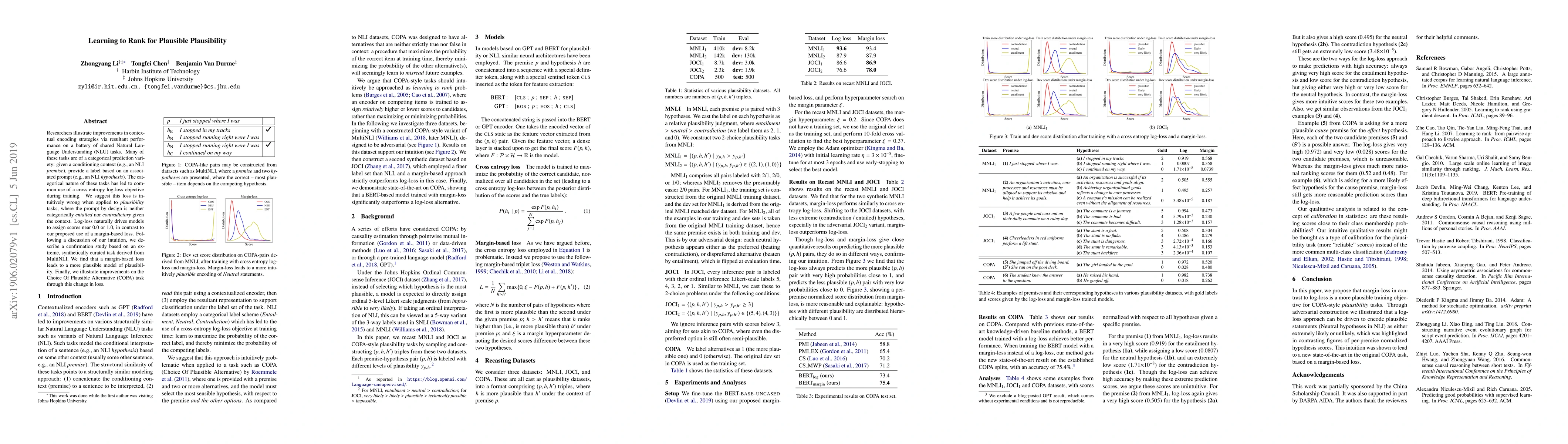 Researchers illustrate improvements in contextual encoding strategies via resultant performance on a battery of shared Natural Language Understanding (NLU) tasks. Many of these tasks are of a categorical prediction variety: given a conditioning context (e.g., an NLI premise), provide a label based on an associated prompt (e.g., an NLI hypothesis). The categorical nature of these tasks has led to common use of a cross entropy log-loss objective during training. We suggest this loss is intuitively wrong when applied to plausibility tasks, where the prompt by design is neither categorically entailed nor contradictory given the context. Log-loss naturally drives models to assign scores near 0.0 or 1.0, in contrast to our proposed use of a margin-based loss. Following a discussion of our intuition, we describe a confirmation study based on an extreme, synthetically curated task derived from MultiNLI. We find that a margin-based loss leads to a more plausible model of plausibility. Finally, we illustrate improvements on the Choice Of Plausible Alternative (COPA) task through this change in loss.