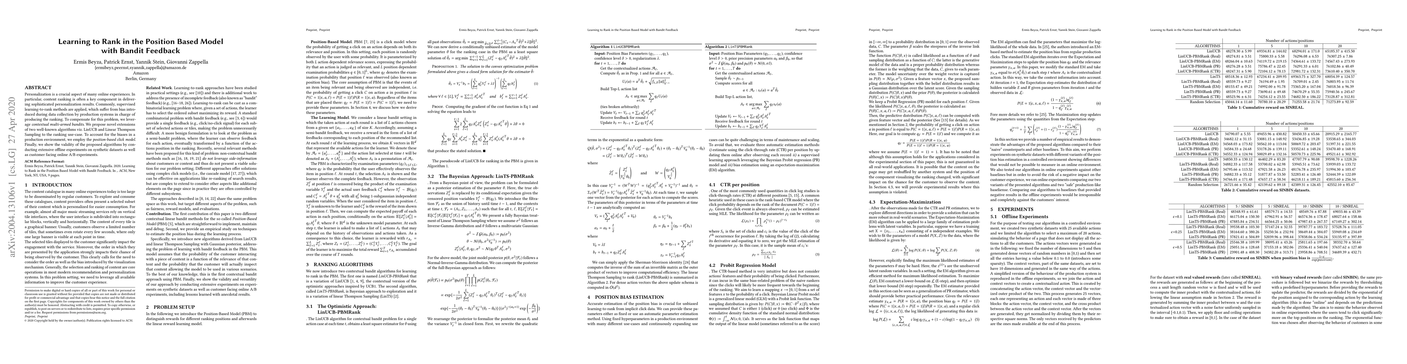 Personalization is a crucial aspect of many online experiences. In particular, content ranking is often a key component in delivering sophisticated personalization results. Commonly, supervised learning-to-rank methods are applied, which suffer from bias introduced during data collection by production systems in charge of producing the ranking. To compensate for this problem, we leverage contextual multi-armed bandits. We propose novel extensions of two well-known algorithms viz. LinUCB and Linear Thompson Sampling to the ranking use-case. To account for the biases in a production environment, we employ the position-based click model. Finally, we show the validity of the proposed algorithms by conducting extensive offline experiments on synthetic datasets as well as customer facing online A/B experiments.
