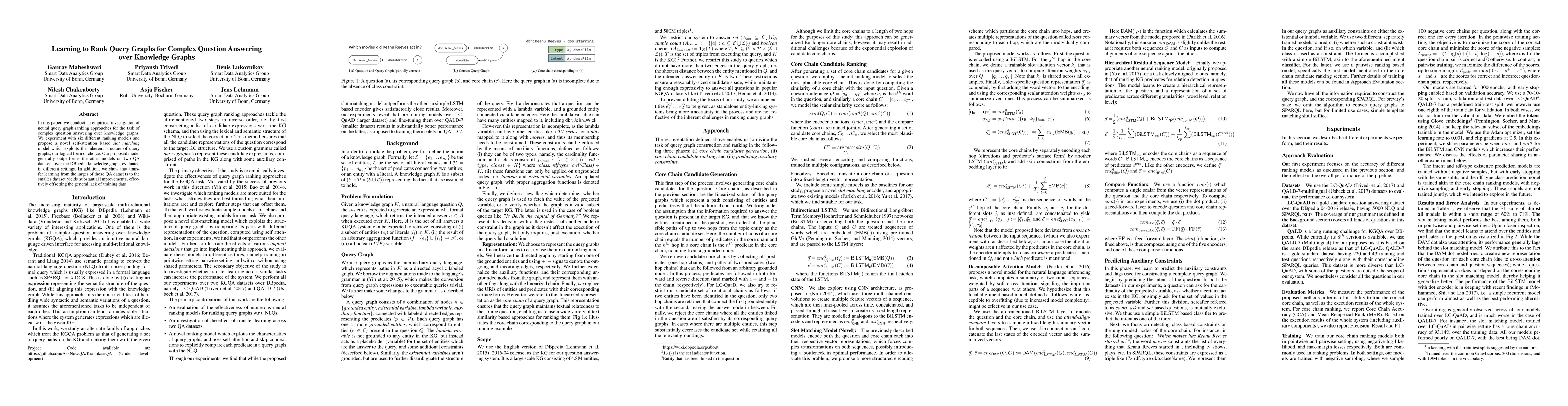 This paper investigates neural query graph ranking methods for complex question answering over knowledge graphs, experimenting with six models and proposing a novel self-attention based slot matching model. The proposed model outperforms others on two QA datasets over DBpedia, and transfer learning from larger to smaller datasets significantly improves performance.