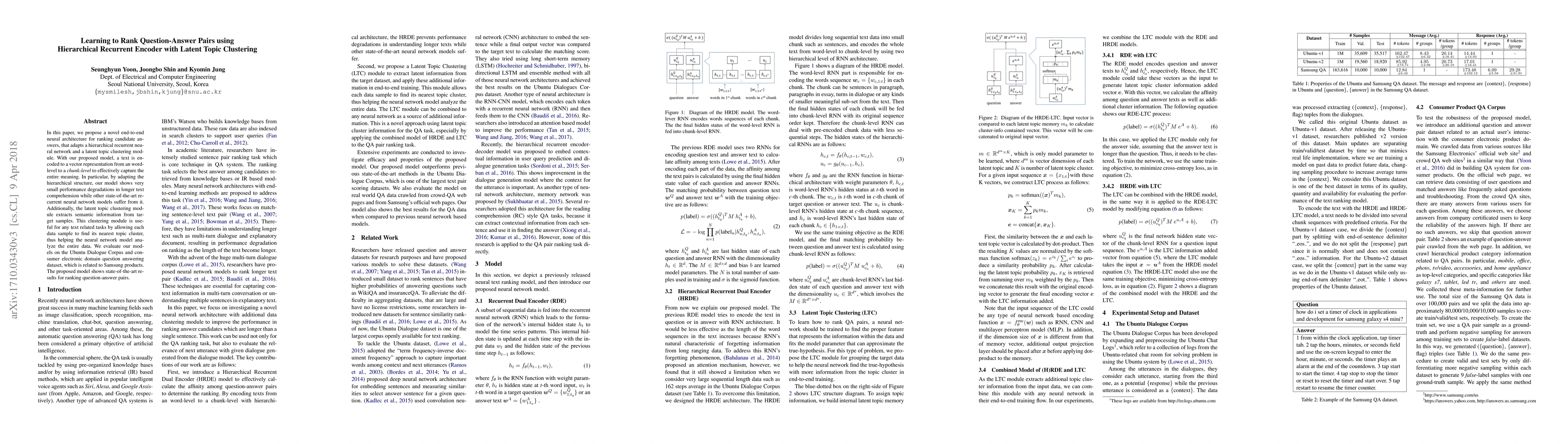 This paper introduces a neural architecture combining hierarchical recurrent networks and latent topic clustering to rank question-answer pairs effectively. The model demonstrates superior performance, especially in longer texts, and achieves state-of-the-art results on Ubuntu Dialogue Corpus and Samsung product datasets.