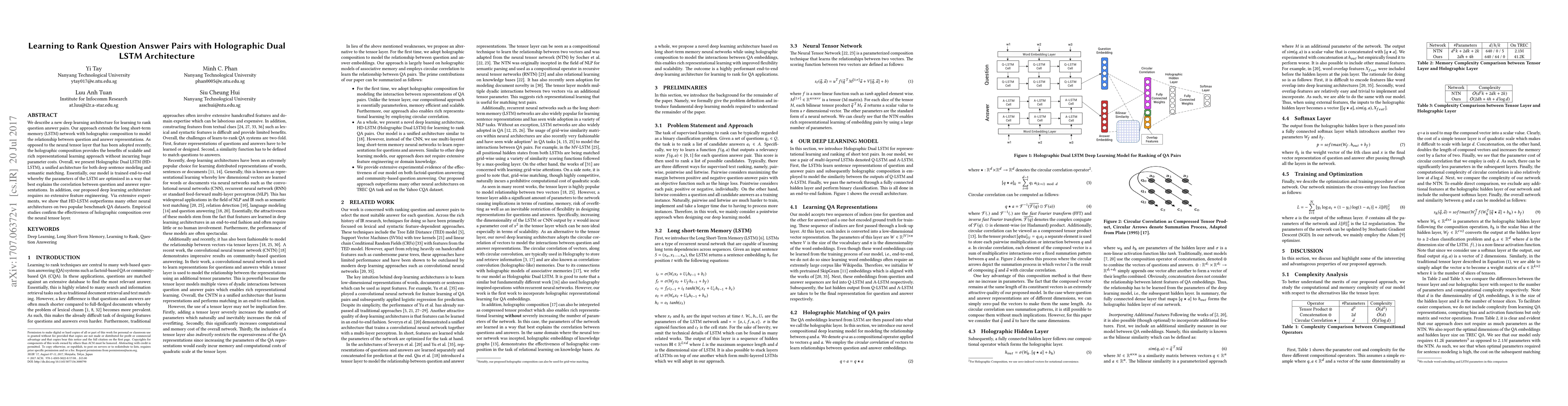 This paper introduces Holographic Dual LSTM (HD-LSTM), a novel deep learning architecture that extends LSTM with holographic composition for ranking question-answer pairs. The model outperforms other neural architectures on benchmark datasets, demonstrating the effectiveness of holographic composition over neural tensor layers.