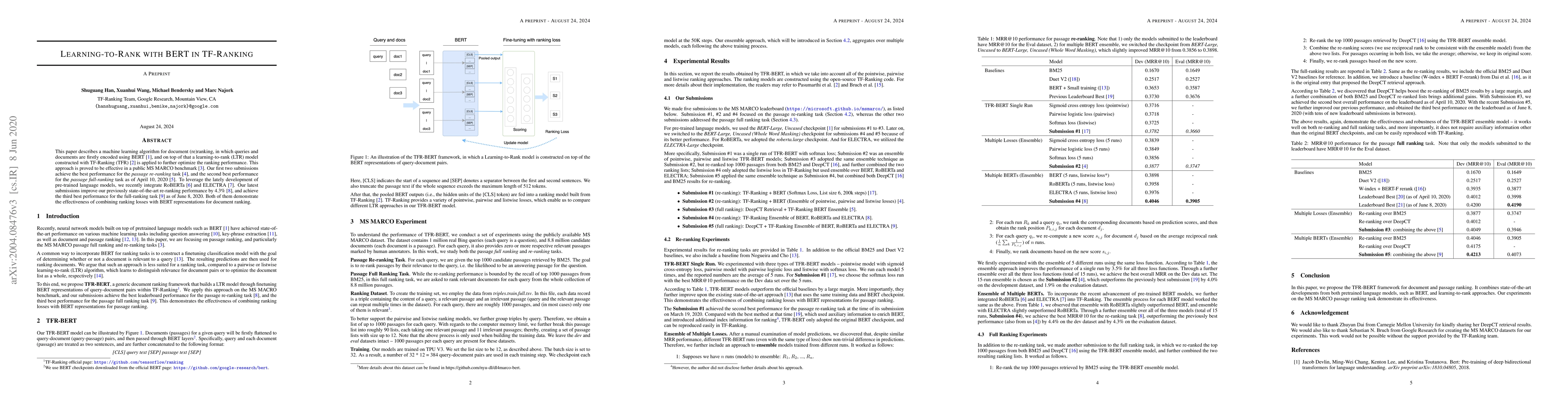This paper proposes a document ranking algorithm using BERT for encoding queries and documents, followed by a learning-to-rank model in TF-Ranking, achieving top results in MS MARCO benchmarks. The integration of RoBERTa and ELECTRA further enhances performance, demonstrating the effectiveness of combining ranking losses with advanced language models.