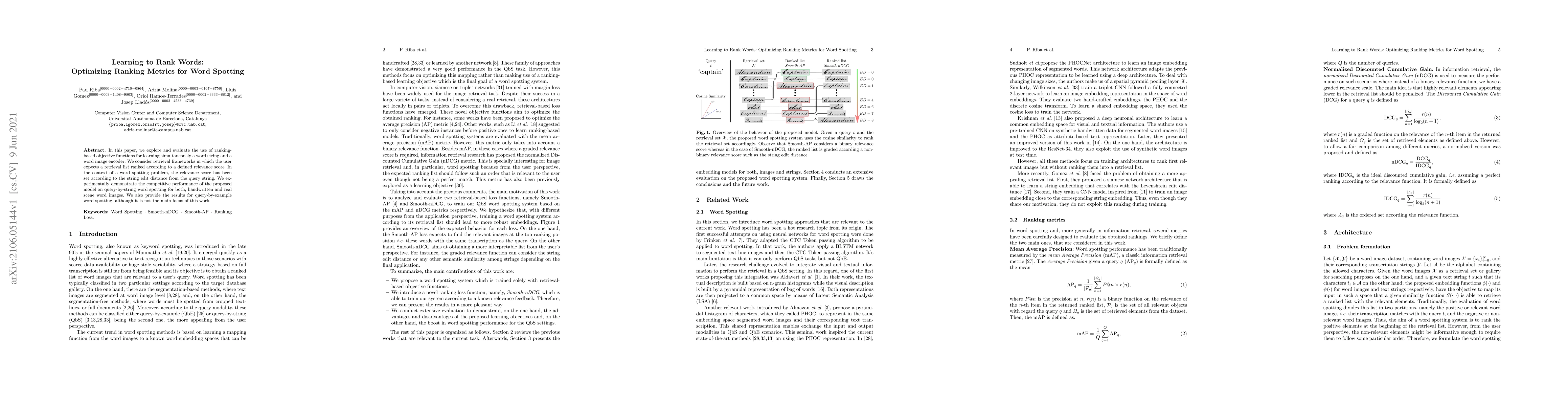This paper investigates ranking-based objective functions for learning word string and image encoders, demonstrating competitive performance in query-by-string word spotting for handwritten and real scene word images, with relevance scores based on string edit distance. Secondary results for query-by-example word spotting are also presented.