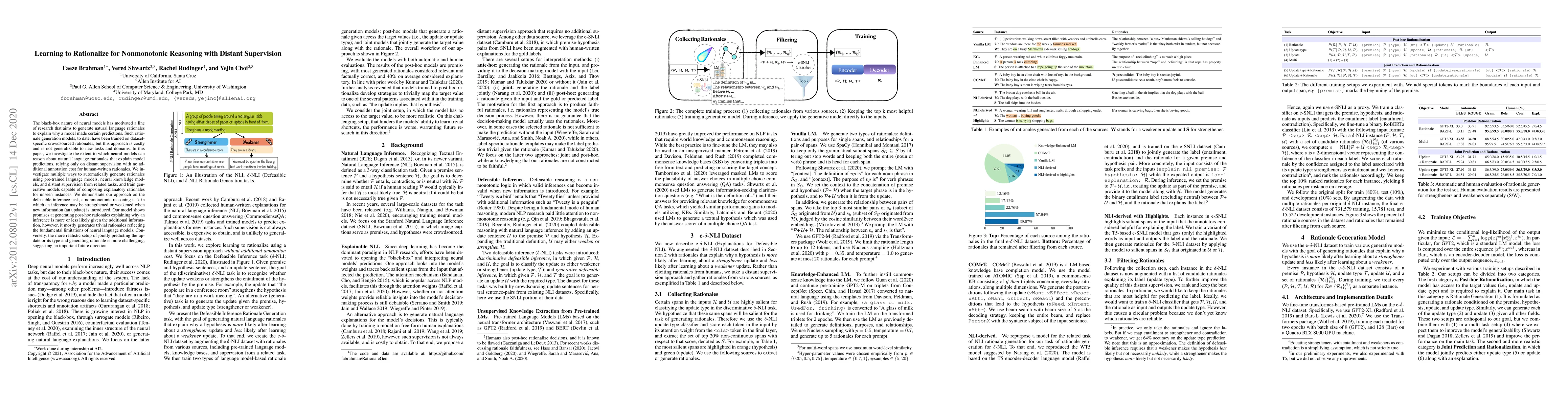 The black-box nature of neural models has motivated a line of research that aims to generate natural language rationales to explain why a model made certain predictions. Such rationale generation models, to date, have been trained on dataset-specific crowdsourced rationales, but this approach is costly and is not generalizable to new tasks and domains. In this paper, we investigate the extent to which neural models can reason about natural language rationales that explain model predictions, relying only on distant supervision with no additional annotation cost for human-written rationales. We investigate multiple ways to automatically generate rationales using pre-trained language models, neural knowledge models, and distant supervision from related tasks, and train generative models capable of composing explanatory rationales for unseen instances. We demonstrate our approach on the defeasible inference task, a nonmonotonic reasoning task in which an inference may be strengthened or weakened when new information (an update) is introduced. Our model shows promises at generating post-hoc rationales explaining why an inference is more or less likely given the additional information, however, it mostly generates trivial rationales reflecting the fundamental limitations of neural language models. Conversely, the more realistic setup of jointly predicting the update or its type and generating rationale is more challenging, suggesting an important future direction.