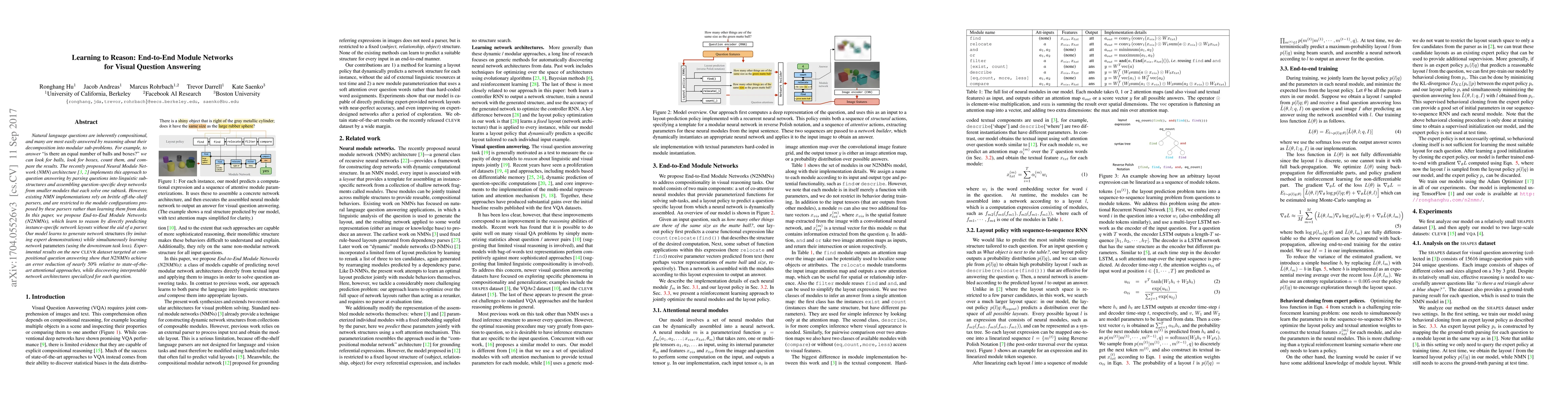 This paper introduces End-to-End Module Networks (N2NMNs) for visual question answering, which learn to generate instance-specific network layouts directly from data without relying on pre-defined parsers. The model achieves nearly 50% relative error reduction compared to state-of-the-art methods, demonstrating improved reasoning through learned, specialized network architectures.