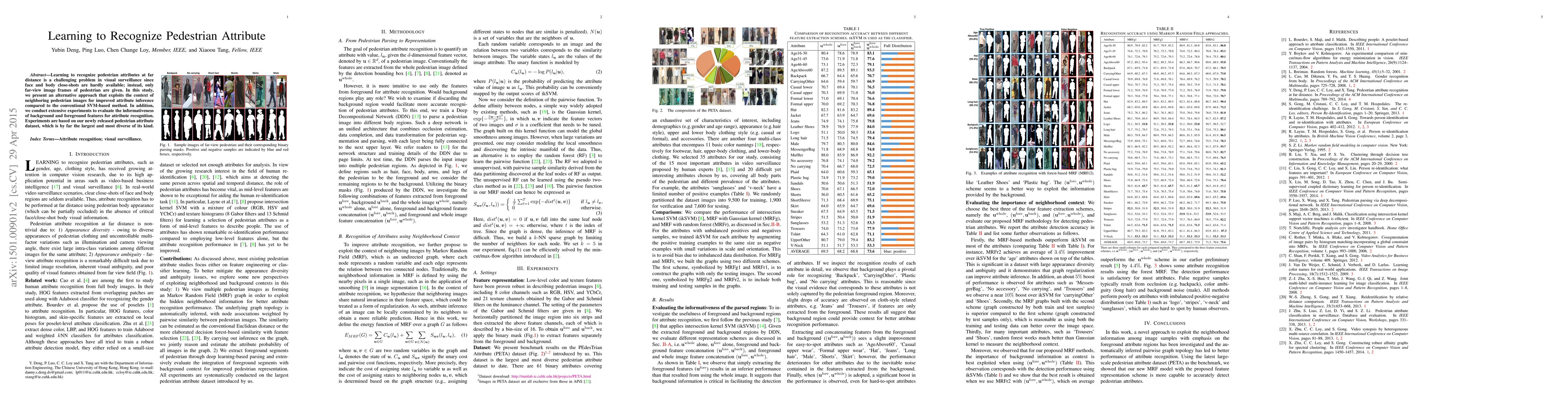 This paper proposes an innovative approach to recognize pedestrian attributes from distant images by leveraging neighboring pedestrian context, surpassing conventional SVM-based methods. Extensive experiments on a newly released large and diverse pedestrian attribute dataset evaluate the effectiveness of background and foreground features for attribute recognition.