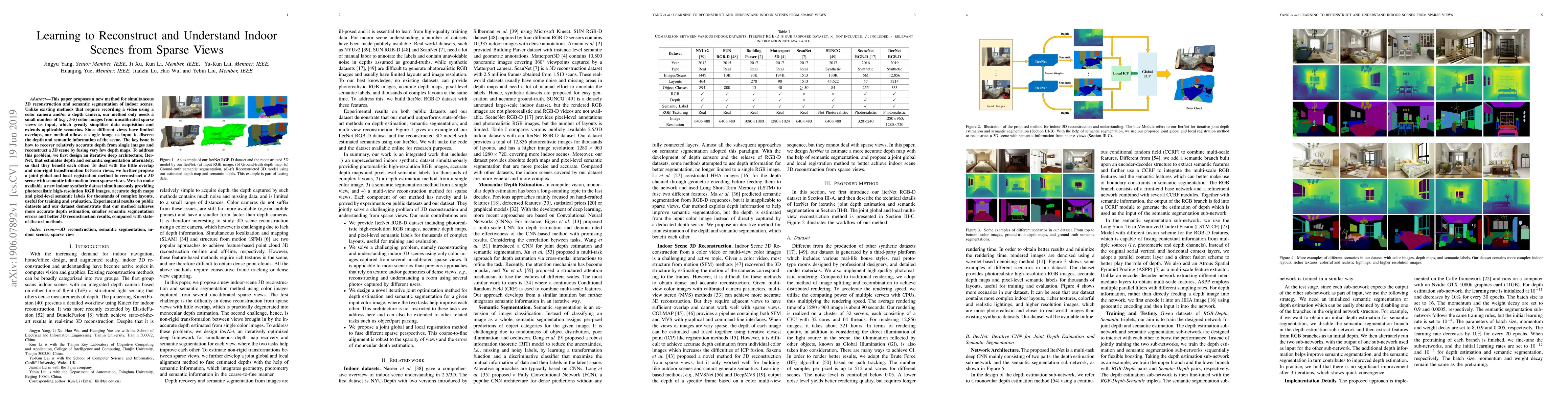 This paper proposes a new method for simultaneous 3D reconstruction and semantic segmentation of indoor scenes. Unlike existing methods that require recording a video using a color camera and/or a depth camera, our method only needs a small number of (e.g., 3-5) color images from uncalibrated sparse views as input, which greatly simplifies data acquisition and extends applicable scenarios. Since different views have limited overlaps, our method allows a single image as input to discern the depth and semantic information of the scene. The key issue is how to recover relatively accurate depth from single images and reconstruct a 3D scene by fusing very few depth maps. To address this problem, we first design an iterative deep architecture, IterNet, that estimates depth and semantic segmentation alternately, so that they benefit each other. To deal with the little overlap and non-rigid transformation between views, we further propose a joint global and local registration method to reconstruct a 3D scene with semantic information from sparse views. We also make available a new indoor synthetic dataset simultaneously providing photorealistic high-resolution RGB images, accurate depth maps and pixel-level semantic labels for thousands of complex layouts, useful for training and evaluation. Experimental results on public datasets and our dataset demonstrate that our method achieves more accurate depth estimation, smaller semantic segmentation errors and better 3D reconstruction results, compared with state-of-the-art methods.
