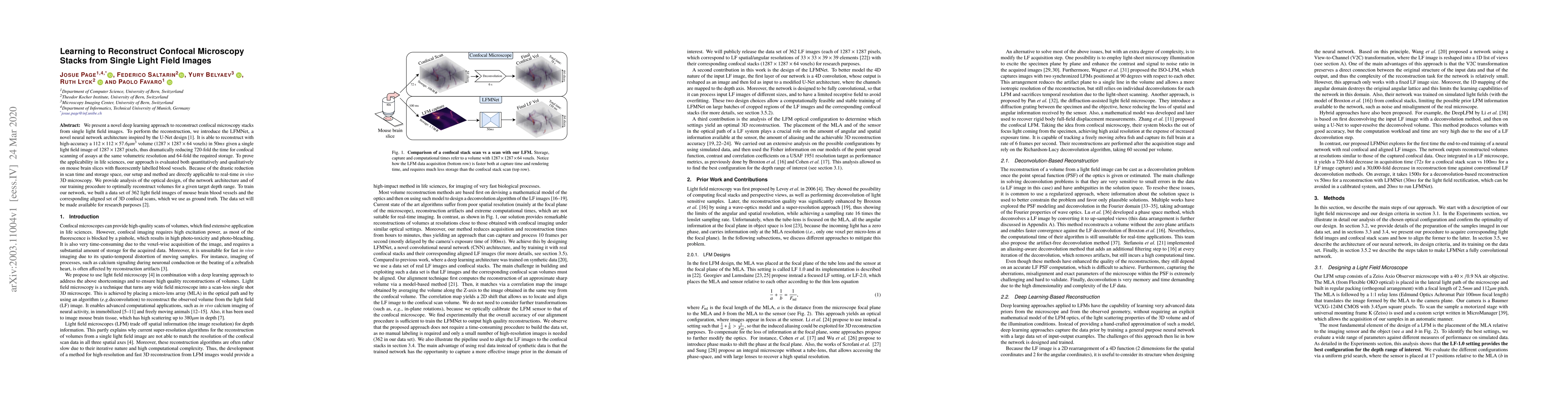 We present a novel deep learning approach to reconstruct confocal microscopy stacks from single light field images. To perform the reconstruction, we introduce the LFMNet, a novel neural network architecture inspired by the U-Net design. It is able to reconstruct with high-accuracy a 112x112x57.6$\mu m^3$ volume (1287x1287x64 voxels) in 50ms given a single light field image of 1287x1287 pixels, thus dramatically reducing 720-fold the time for confocal scanning of assays at the same volumetric resolution and 64-fold the required storage. To prove the applicability in life sciences, our approach is evaluated both quantitatively and qualitatively on mouse brain slices with fluorescently labelled blood vessels. Because of the drastic reduction in scan time and storage space, our setup and method are directly applicable to real-time in vivo 3D microscopy. We provide analysis of the optical design, of the network architecture and of our training procedure to optimally reconstruct volumes for a given target depth range. To train our network, we built a data set of 362 light field images of mouse brain blood vessels and the corresponding aligned set of 3D confocal scans, which we use as ground truth. The data set will be made available for research purposes.