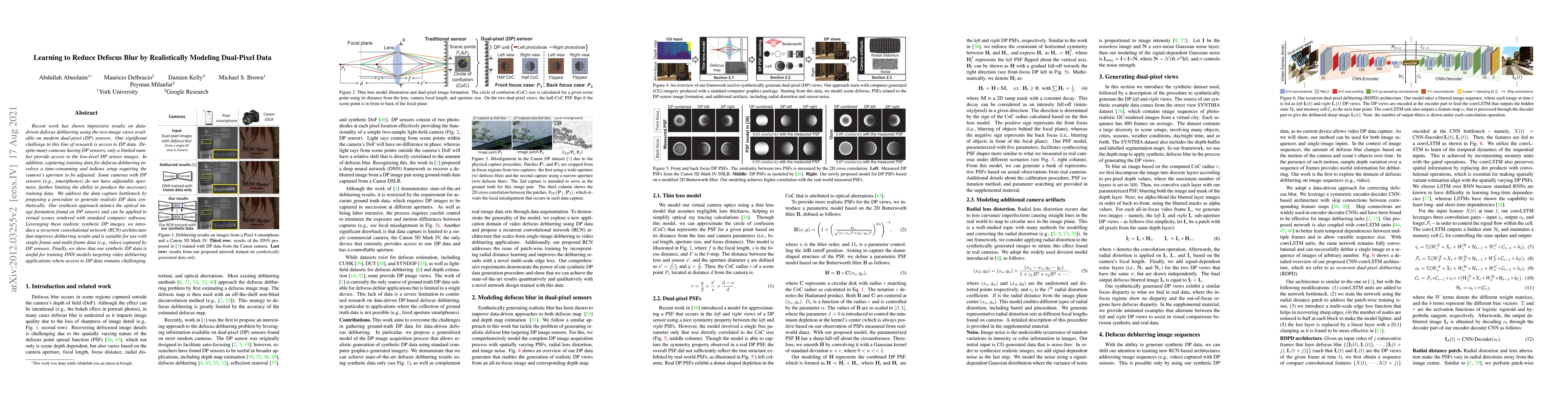 Recent work has shown impressive results on data-driven defocus deblurring using the two-image views available on modern dual-pixel (DP) sensors. One significant challenge in this line of research is access to DP data. Despite many cameras having DP sensors, only a limited number provide access to the low-level DP sensor images. In addition, capturing training data for defocus deblurring involves a time-consuming and tedious setup requiring the camera's aperture to be adjusted. Some cameras with DP sensors (e.g., smartphones) do not have adjustable apertures, further limiting the ability to produce the necessary training data. We address the data capture bottleneck by proposing a procedure to generate realistic DP data synthetically. Our synthesis approach mimics the optical image formation found on DP sensors and can be applied to virtual scenes rendered with standard computer software. Leveraging these realistic synthetic DP images, we introduce a recurrent convolutional network (RCN) architecture that improves deblurring results and is suitable for use with single-frame and multi-frame data (e.g., video) captured by DP sensors. Finally, we show that our synthetic DP data is useful for training DNN models targeting video deblurring applications where access to DP data remains challenging.