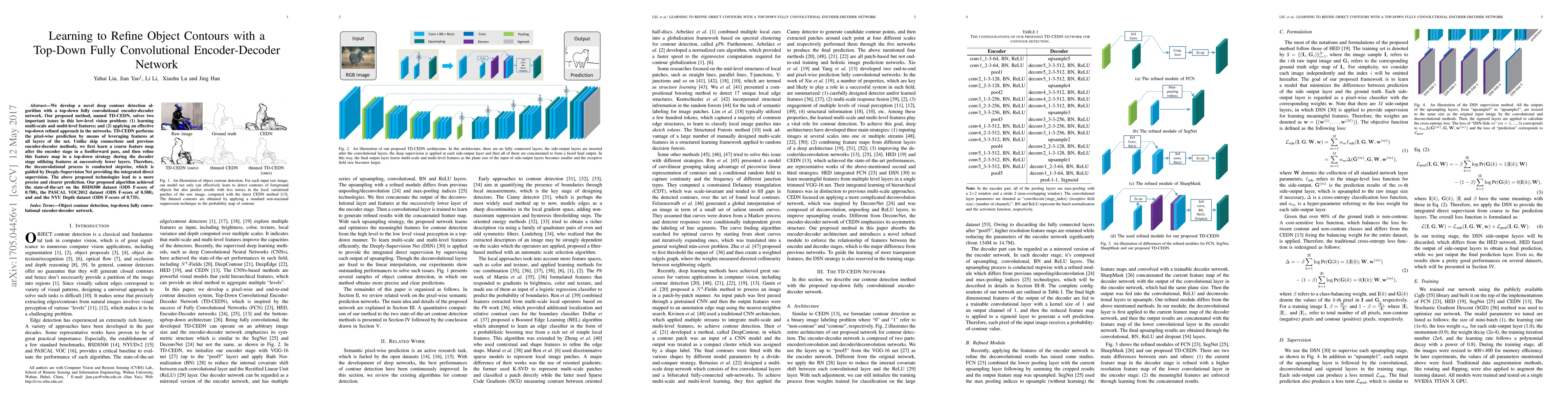 This paper introduces TD-CEDN, a top-down fully convolutional encoder-decoder network for precise contour detection, addressing multi-scale feature learning and top-down refinement. The method achieves state-of-the-art results on BSDS500, PASCAL VOC2012, and NYU Depth datasets.