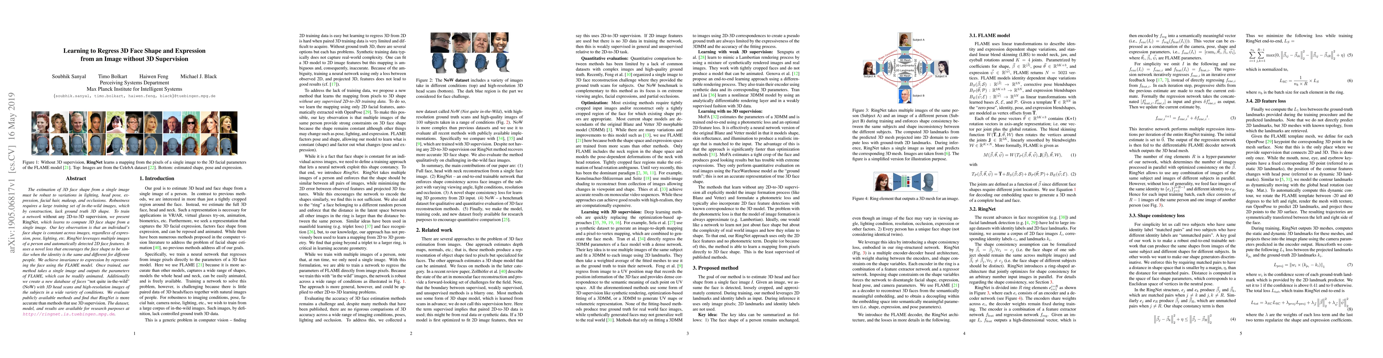 The estimation of 3D face shape from a single image must be robust to variations in lighting, head pose, expression, facial hair, makeup, and occlusions. Robustness requires a large training set of in-the-wild images, which by construction, lack ground truth 3D shape. To train a network without any 2D-to-3D supervision, we present RingNet, which learns to compute 3D face shape from a single image. Our key observation is that an individual's face shape is constant across images, regardless of expression, pose, lighting, etc. RingNet leverages multiple images of a person and automatically detected 2D face features. It uses a novel loss that encourages the face shape to be similar when the identity is the same and different for different people. We achieve invariance to expression by representing the face using the FLAME model. Once trained, our method takes a single image and outputs the parameters of FLAME, which can be readily animated. Additionally we create a new database of faces `not quite in-the-wild' (NoW) with 3D head scans and high-resolution images of the subjects in a wide variety of conditions. We evaluate publicly available methods and find that RingNet is more accurate than methods that use 3D supervision. The dataset, model, and results are available for research purposes at http://ringnet.is.tuebingen.mpg.de.
