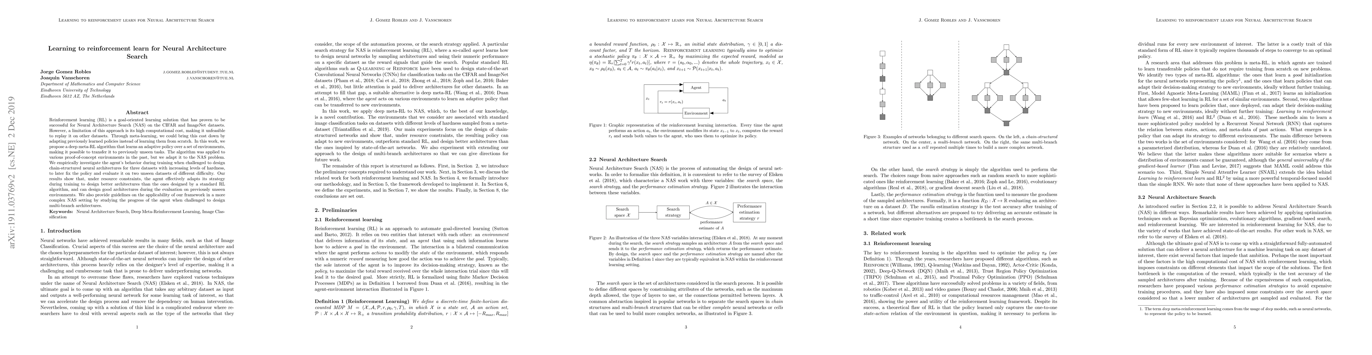 This paper proposes a deep meta-reinforcement learning algorithm to reduce the computational cost of Neural Architecture Search (NAS) by adapting previously learned policies. The method effectively designs better neural architectures under resource constraints and demonstrates successful transfer to unseen datasets.
