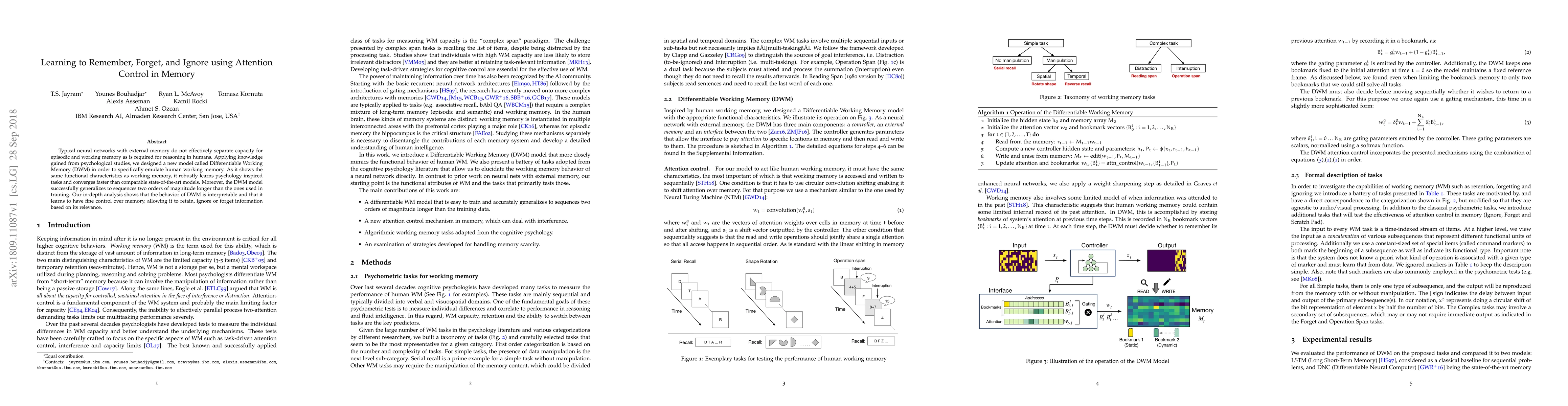 Typical neural networks with external memory do not effectively separate capacity for episodic and working memory as is required for reasoning in humans. Applying knowledge gained from psychological studies, we designed a new model called Differentiable Working Memory (DWM) in order to specifically emulate human working memory. As it shows the same functional characteristics as working memory, it robustly learns psychology inspired tasks and converges faster than comparable state-of-the-art models. Moreover, the DWM model successfully generalizes to sequences two orders of magnitude longer than the ones used in training. Our in-depth analysis shows that the behavior of DWM is interpretable and that it learns to have fine control over memory, allowing it to retain, ignore or forget information based on its relevance.