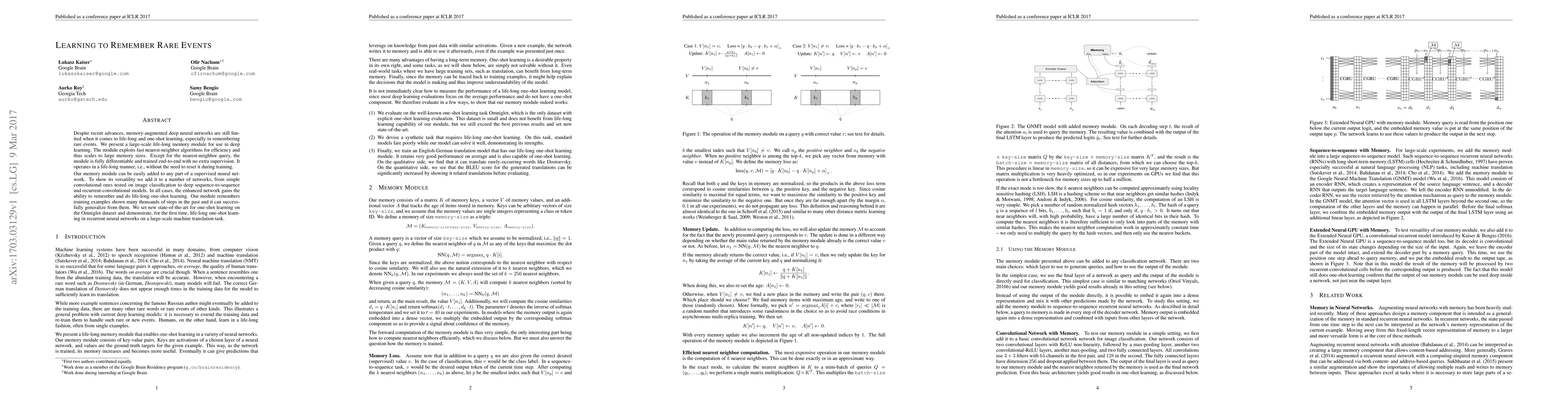 This paper introduces a scalable life-long memory module for deep learning that enhances neural networks' ability to remember rare events and perform one-shot learning. The module, which leverages efficient nearest-neighbor algorithms, is fully differentiable and can be integrated into various network architectures, achieving state-of-the-art results in one-shot learning and demonstrating life-long learning capabilities.