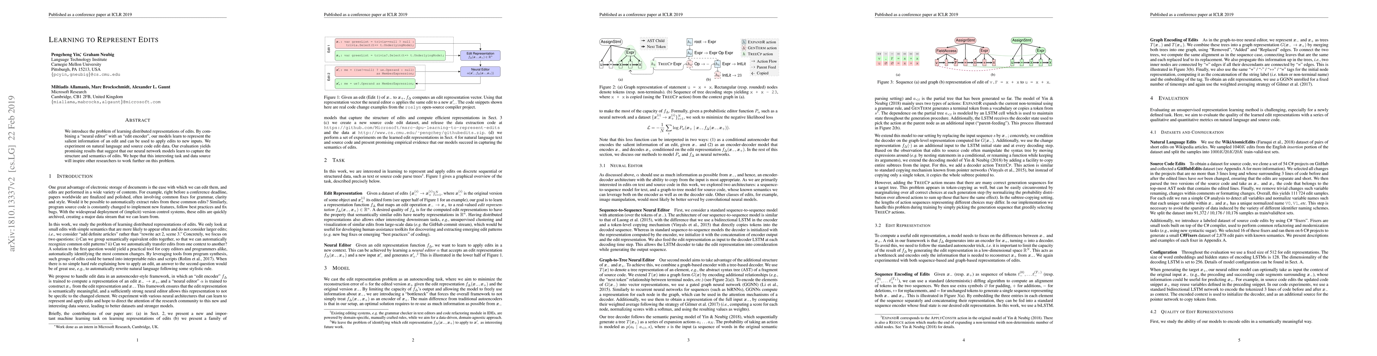 This paper proposes a method to learn distributed representations of edits using a neural editor and an edit encoder, demonstrating its effectiveness on natural language and source code data, and showing promising results in capturing edit structure and semantics. The authors hope to inspire further research in this novel area.