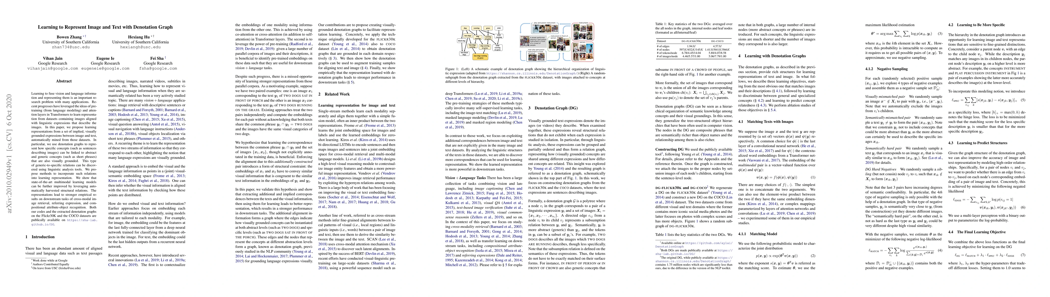 Learning to fuse vision and language information and representing them is an important research problem with many applications. Recent progresses have leveraged the ideas of pre-training (from language modeling) and attention layers in Transformers to learn representation from datasets containing images aligned with linguistic expressions that describe the images. In this paper, we propose learning representations from a set of implied, visually grounded expressions between image and text, automatically mined from those datasets. In particular, we use denotation graphs to represent how specific concepts (such as sentences describing images) can be linked to abstract and generic concepts (such as short phrases) that are also visually grounded. This type of generic-to-specific relations can be discovered using linguistic analysis tools. We propose methods to incorporate such relations into learning representation. We show that state-of-the-art multimodal learning models can be further improved by leveraging automatically harvested structural relations. The representations lead to stronger empirical results on downstream tasks of cross-modal image retrieval, referring expression, and compositional attribute-object recognition. Both our codes and the extracted denotation graphs on the Flickr30K and the COCO datasets are publically available on https://sha-lab.github.io/DG.