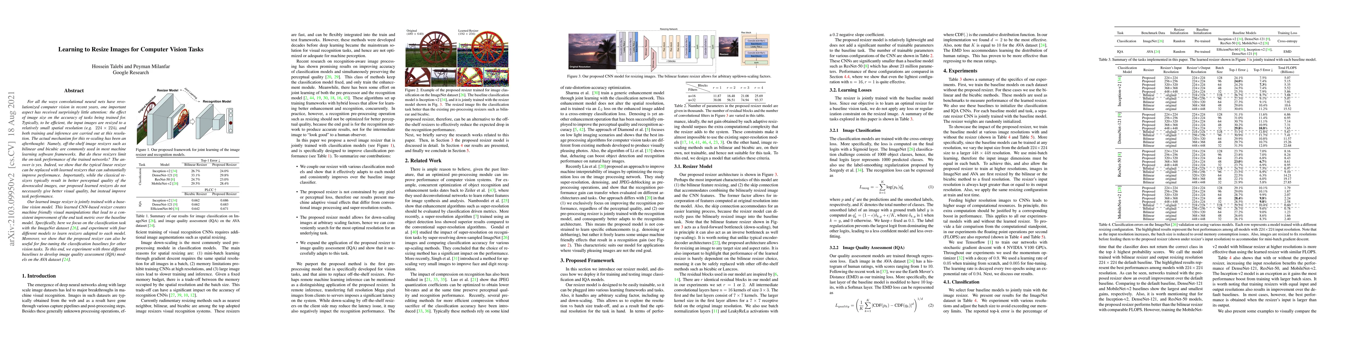 This research demonstrates that using learned, rather than linear, image resizers can significantly enhance the performance of computer vision tasks, like image classification on ImageNet. The study jointly trains a CNN-based resizer with baseline models, improving task metrics without necessarily boosting perceptual image quality. The method's effectiveness is also shown in fine-tuning classification models for other vision tasks, such as developing image quality assessment models on the AVA dataset.