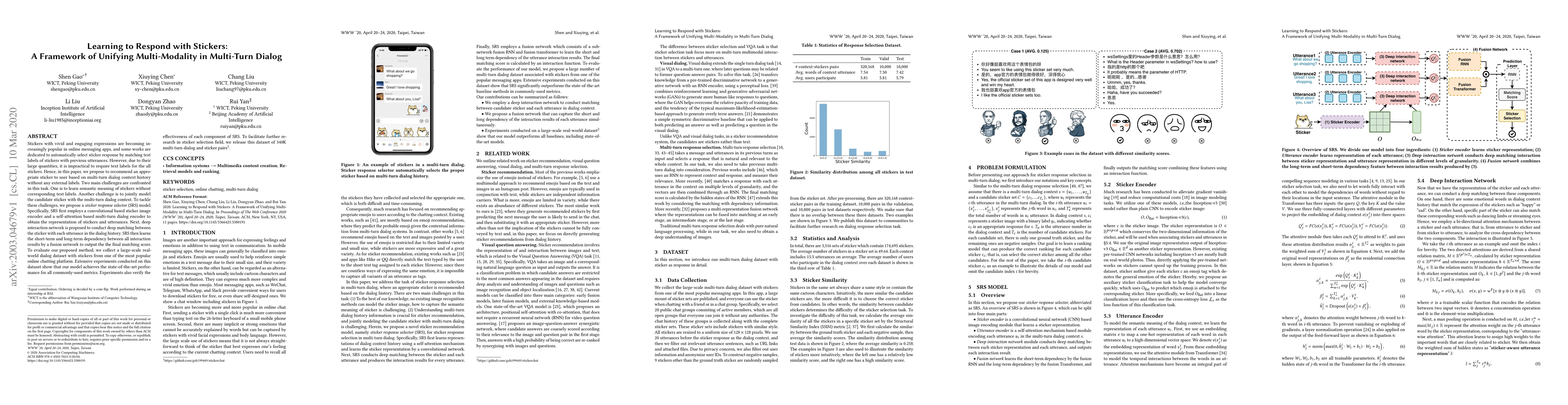 This paper proposes a sticker response selector (SRS) model to recommend stickers in multi-turn dialog without relying on text labels. SRS uses a convolutional encoder for stickers and a self-attention encoder for dialog context, followed by a deep interaction network to match stickers with utterances, and a fusion network to capture dependencies, achieving state-of-the-art performance on a new dataset.