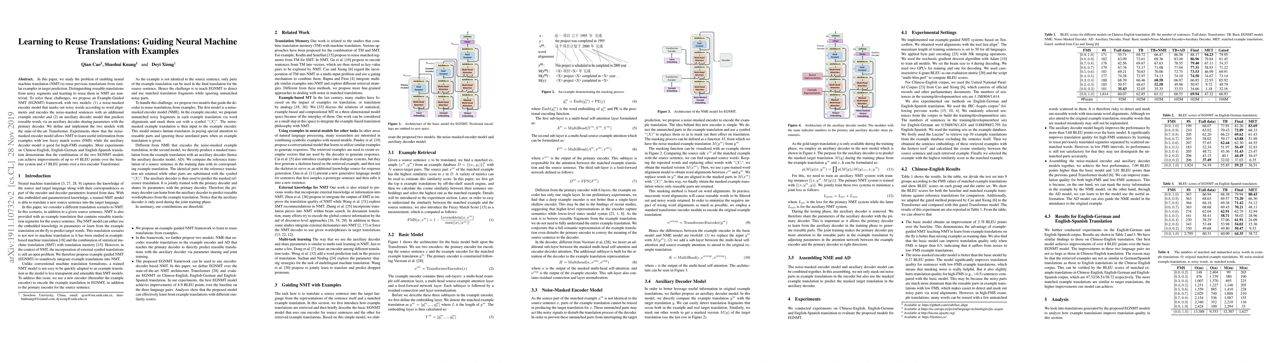 This paper proposes an Example-Guided NMT (EGNMT) framework to enable neural machine translation to reuse previous translations from similar examples. The framework includes a noise-masked encoder and an auxiliary decoder, achieving up to +9 BLEU points improvement over baseline systems in multiple language pairs.