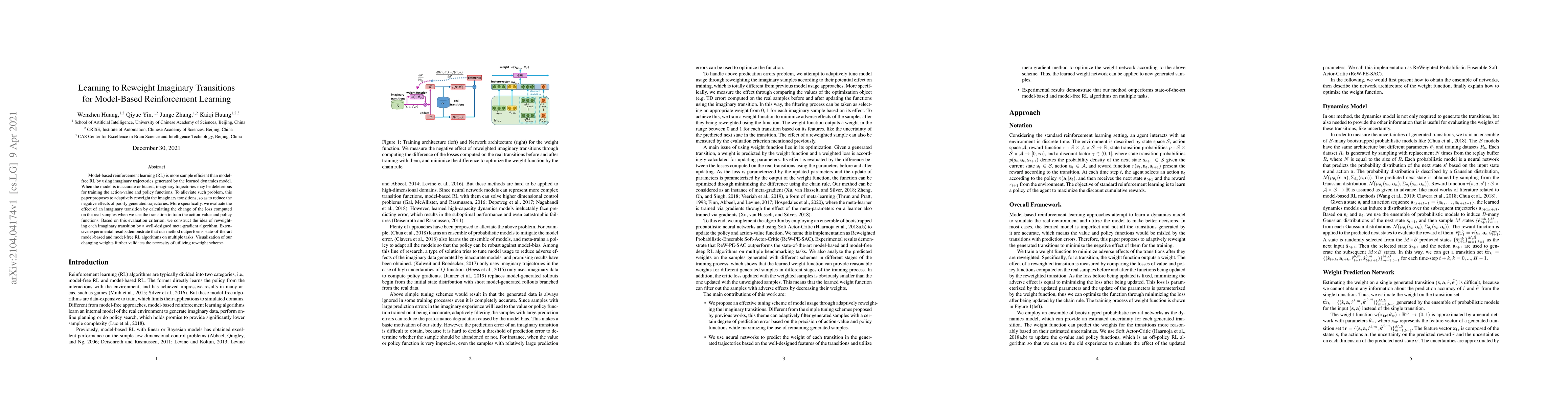 A new method for model-based reinforcement learning adaptsively reweights imaginary transitions to reduce their negative impact on training, leading to improved performance over state-of-the-art algorithms.