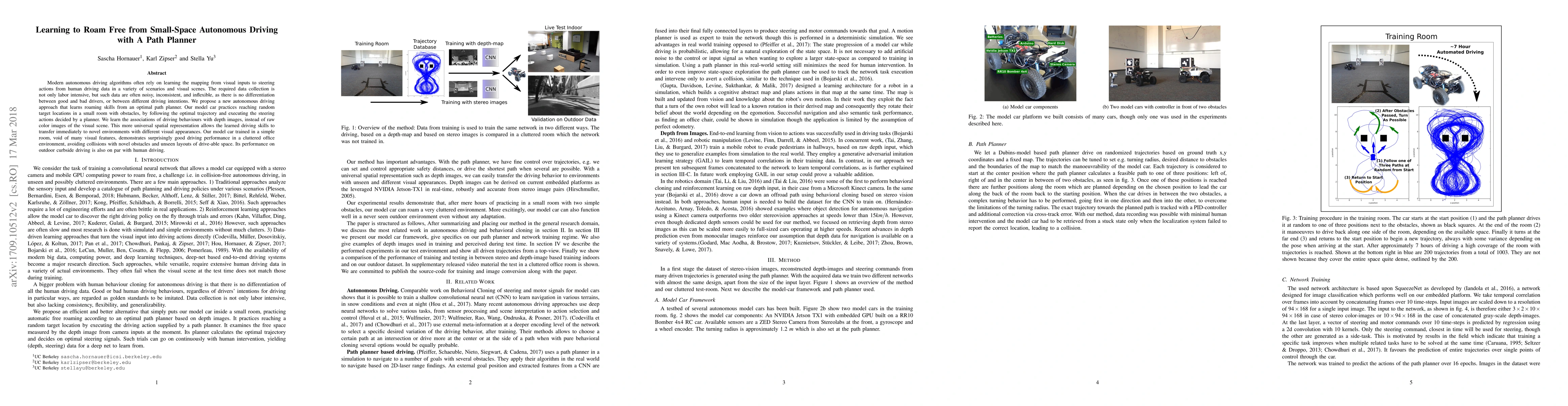 Modern autonomous driving algorithms often rely on learning the mapping from visual inputs to steering actions from human driving data in a variety of scenarios and visual scenes. The required data collection is not only labor intensive, but such data are often noisy, inconsistent, and inflexible, as there is no differentiation between good and bad drivers, or between different driving intentions. We propose a new autonomous driving approach that learns roaming skills from an optimal path planner. Our model car practices reaching random target locations in a small room with obstacles, by following the optimal trajectory and executing the steering actions decided by a planner. We learn the associations of driving behaviours with depth images, instead of raw color images of the visual scene. This more universal spatial representation allows the learned driving skills to transfer immediately to novel environments with different visual appearances. Our model car trained in a simple room, void of many visual features, demonstrates surprisingly good driving performance in a cluttered office environment, avoiding collisions with novel obstacles and unseen layouts of drive-able space. Its performance on outdoor curbside driving is also on par with human driving.
