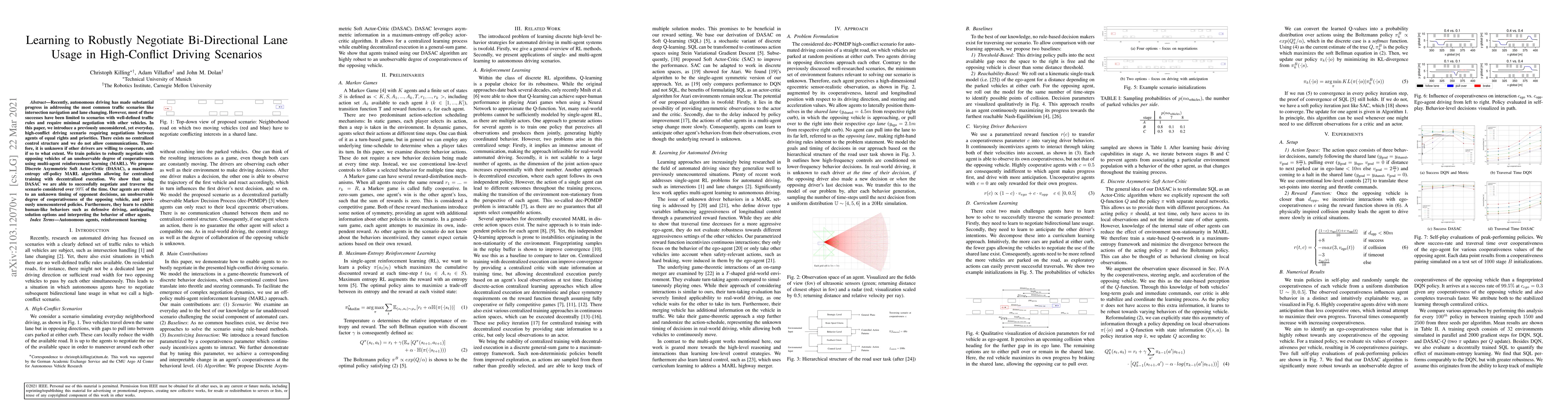 Recently, autonomous driving has made substantial progress in addressing the most common traffic scenarios like intersection navigation and lane changing. However, most of these successes have been limited to scenarios with well-defined traffic rules and require minimal negotiation with other vehicles. In this paper, we introduce a previously unconsidered, yet everyday, high-conflict driving scenario requiring negotiations between agents of equal rights and priorities. There exists no centralized control structure and we do not allow communications. Therefore, it is unknown if other drivers are willing to cooperate, and if so to what extent. We train policies to robustly negotiate with opposing vehicles of an unobservable degree of cooperativeness using multi-agent reinforcement learning (MARL). We propose Discrete Asymmetric Soft Actor-Critic (DASAC), a maximum-entropy off-policy MARL algorithm allowing for centralized training with decentralized execution. We show that using DASAC we are able to successfully negotiate and traverse the scenario considered over 99% of the time. Our agents are robust to an unknown timing of opponent decisions, an unobservable degree of cooperativeness of the opposing vehicle, and previously unencountered policies. Furthermore, they learn to exhibit human-like behaviors such as defensive driving, anticipating solution options and interpreting the behavior of other agents.