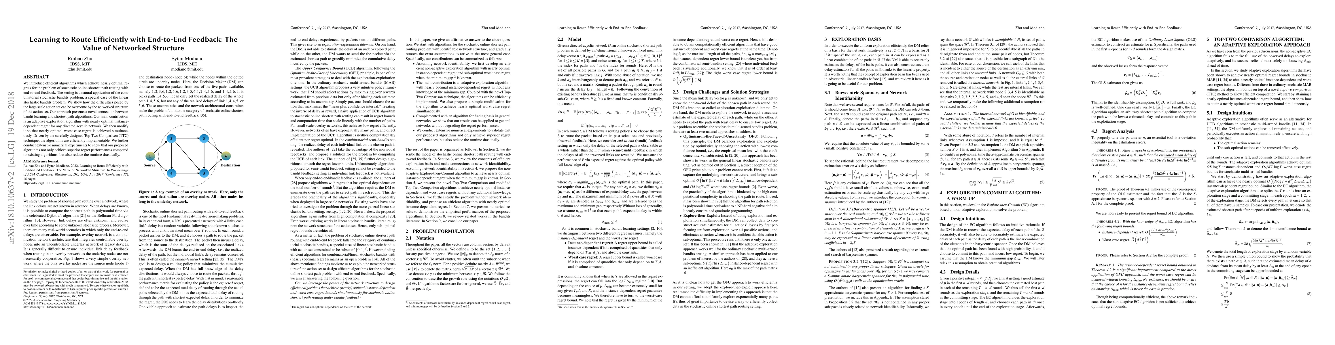 This paper proposes efficient algorithms for stochastic online shortest path routing with end-to-end feedback, leveraging the networked structure to achieve nearly optimal regret. The adaptive exploration algorithm, enhanced by the Top-Two Comparison technique, demonstrates superior performance and significantly reduced runtime in extensive numerical experiments.
