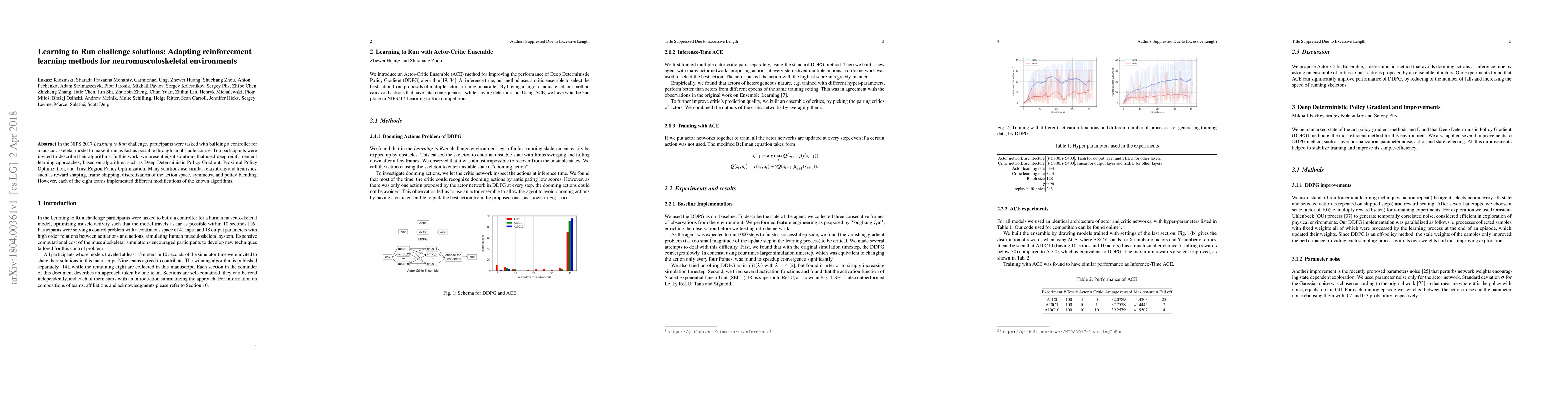 In the NIPS 2017 Learning to Run challenge, participants were tasked with building a controller for a musculoskeletal model to make it run as fast as possible through an obstacle course. Top participants were invited to describe their algorithms. In this work, we present eight solutions that used deep reinforcement learning approaches, based on algorithms such as Deep Deterministic Policy Gradient, Proximal Policy Optimization, and Trust Region Policy Optimization. Many solutions use similar relaxations and heuristics, such as reward shaping, frame skipping, discretization of the action space, symmetry, and policy blending. However, each of the eight teams implemented different modifications of the known algorithms.