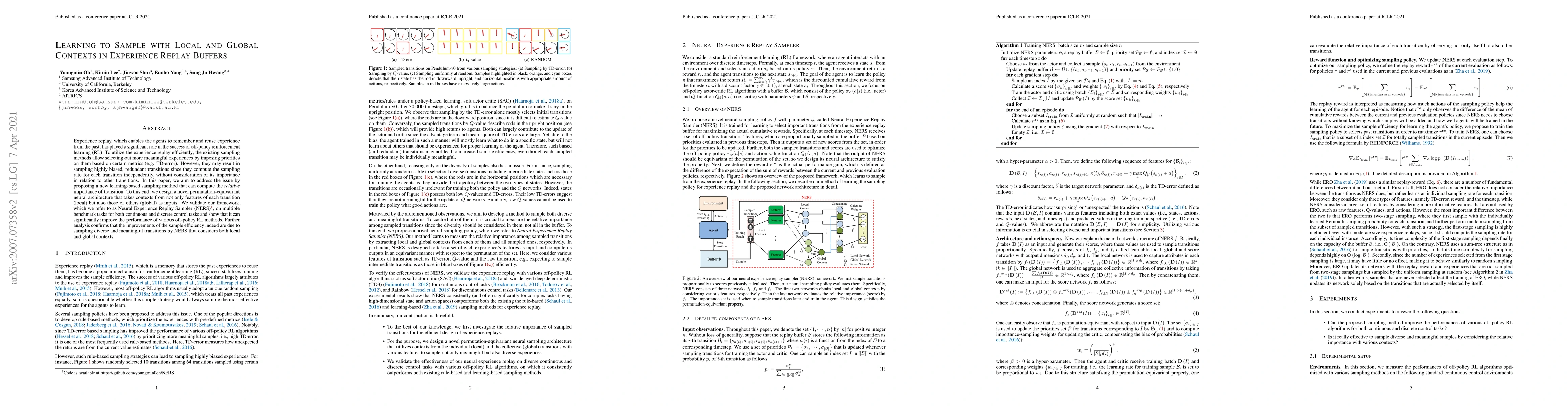 This paper proposes a novel learning-based sampling method called Neural Experience Replay Sampler (NERS) to improve experience replay efficiency in off-policy reinforcement learning. NERS uses a permutation-equivariant neural architecture that considers both local and global contexts to compute the relative importance of transitions, thereby reducing bias and redundancy.