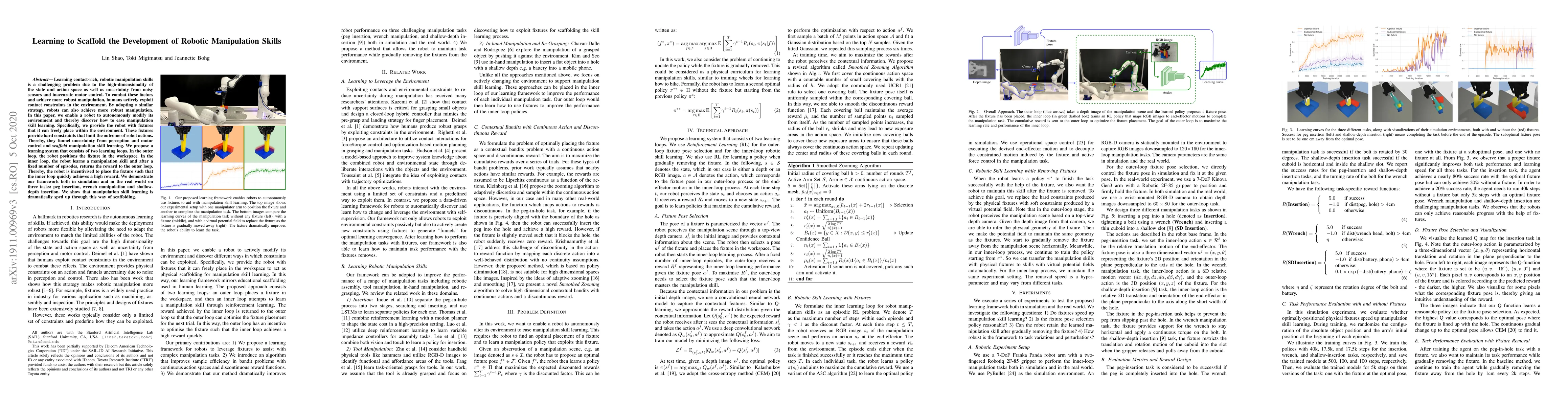 This paper proposes a method for robots to autonomously modify their environment using fixtures to scaffold the learning of manipulation skills, thereby reducing the high-dimensionality and uncertainty in state and action spaces. The robot employs a dual-loop learning system where it places fixtures to optimize manipulation tasks, demonstrated effectively in simulation and real-world scenarios for tasks like peg insertion and wrench manipulation.
