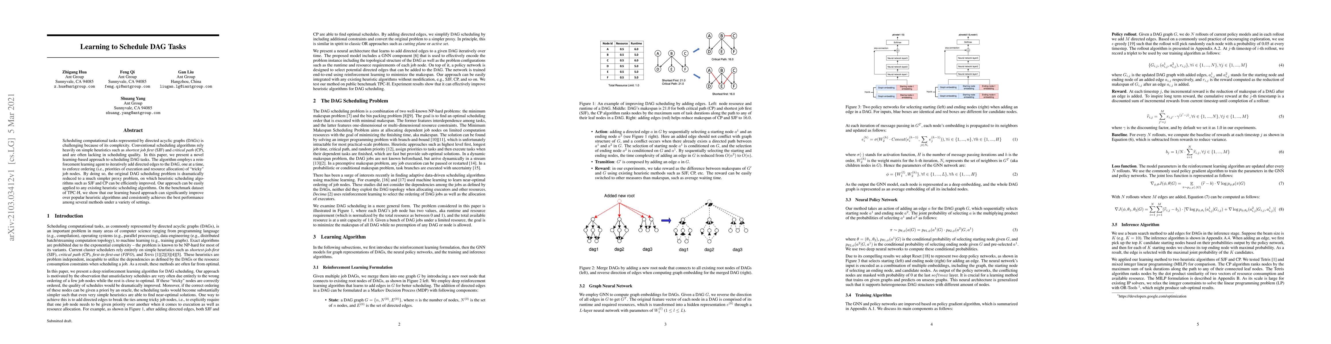 Scheduling computational tasks represented by directed acyclic graphs (DAGs) is challenging because of its complexity. Conventional scheduling algorithms rely heavily on simple heuristics such as shortest job first (SJF) and critical path (CP), and are often lacking in scheduling quality. In this paper, we present a novel learning-based approach to scheduling DAG tasks. The algorithm employs a reinforcement learning agent to iteratively add directed edges to the DAG, one at a time, to enforce ordering (i.e., priorities of execution and resource allocation) of "tricky" job nodes. By doing so, the original DAG scheduling problem is dramatically reduced to a much simpler proxy problem, on which heuristic scheduling algorithms such as SJF and CP can be efficiently improved. Our approach can be easily applied to any existing heuristic scheduling algorithms. On the benchmark dataset of TPC-H, we show that our learning based approach can significantly improve over popular heuristic algorithms and consistently achieves the best performance among several methods under a variety of settings.