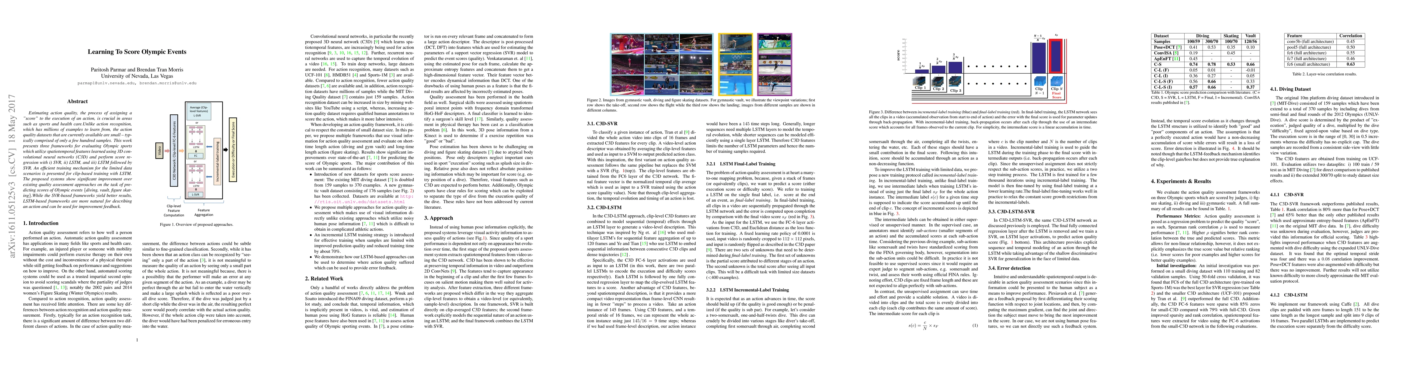 Estimating action quality, the process of assigning a "score" to the execution of an action, is crucial in areas such as sports and health care. Unlike action recognition, which has millions of examples to learn from, the action quality datasets that are currently available are small -- typically comprised of only a few hundred samples. This work presents three frameworks for evaluating Olympic sports which utilize spatiotemporal features learned using 3D convolutional neural networks (C3D) and perform score regression with i) SVR, ii) LSTM, and iii) LSTM followed by SVR. An efficient training mechanism for the limited data scenarios is presented for clip-based training with LSTM. The proposed systems show significant improvement over existing quality assessment approaches on the task of predicting scores of Olympic events {diving, vault, figure skating}. While the SVR-based frameworks yield better results, LSTM-based frameworks are more natural for describing an action and can be used for improvement feedback.