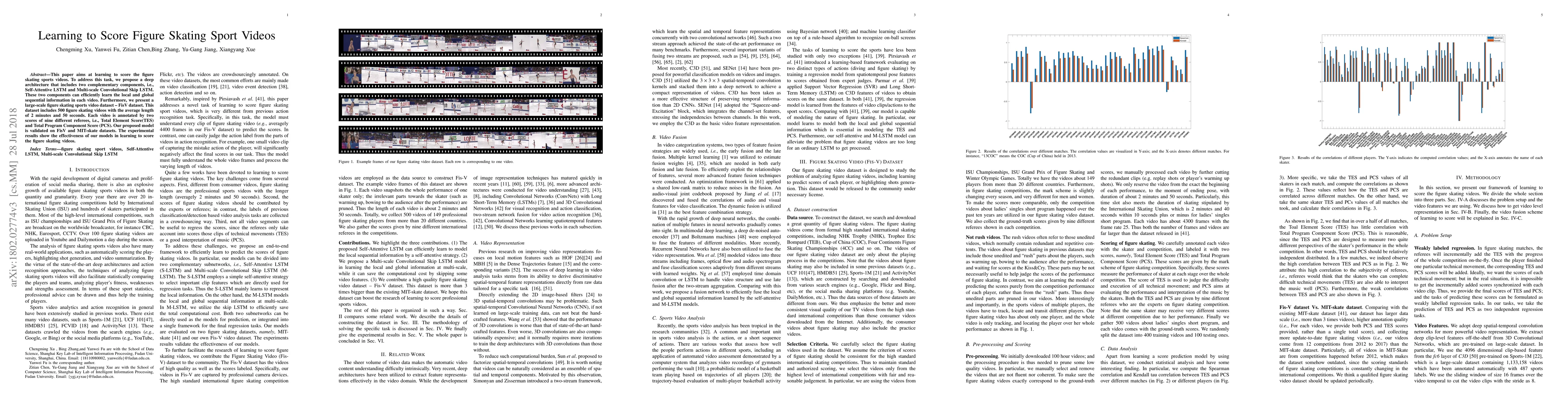 This paper targets at learning to score the figure skating sports videos. To address this task, we propose a deep architecture that includes two complementary components, i.e., Self-Attentive LSTM and Multi-scale Convolutional Skip LSTM. These two components can efficiently learn the local and global sequential information in each video. Furthermore, we present a large-scale figure skating sports video dataset -- FisV dataset. This dataset includes 500 figure skating videos with the average length of 2 minutes and 50 seconds. Each video is annotated by two scores of nine different referees, i.e., Total Element Score(TES) and Total Program Component Score (PCS). Our proposed model is validated on FisV and MIT-skate datasets. The experimental results show the effectiveness of our models in learning to score the figure skating videos.
