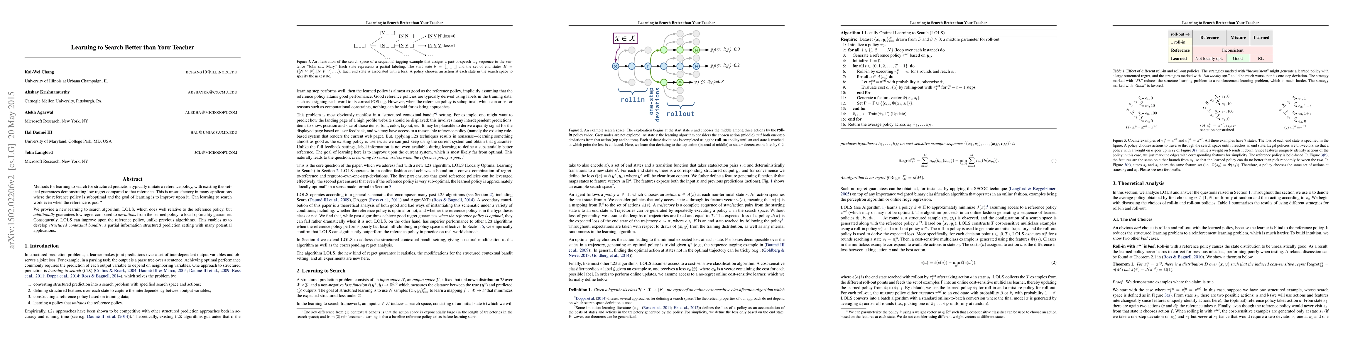 This paper introduces LOLS, a novel learning to search algorithm that not only performs well relative to a suboptimal reference policy but also guarantees low regret compared to deviations from the learned policy, enabling it to outperform the reference. This advancement facilitates the development of structured contextual bandits, a promising approach for structured prediction with partial information.