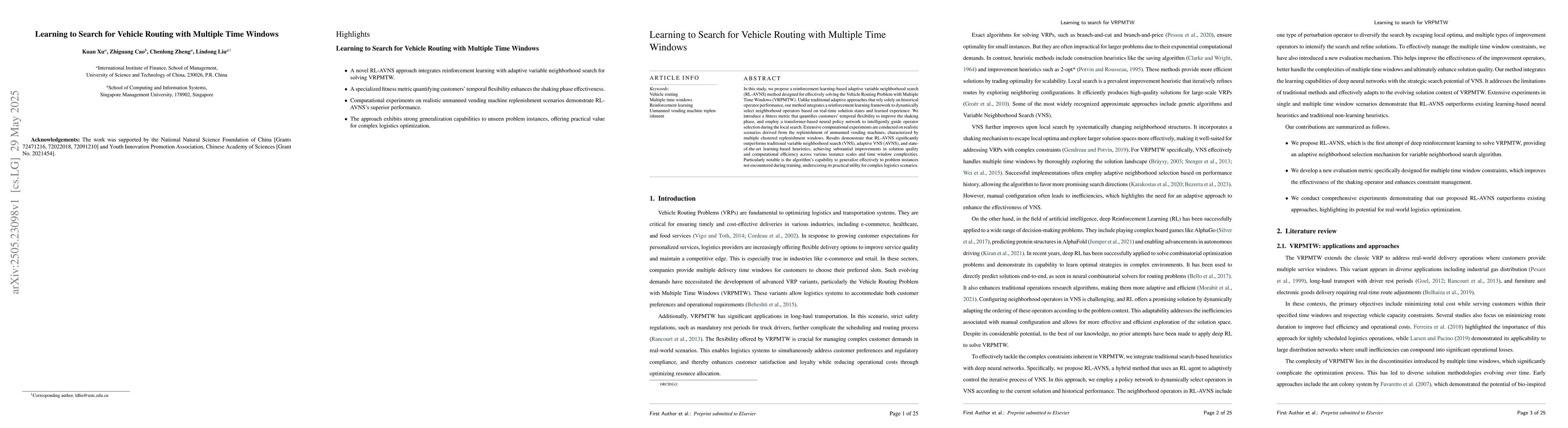 The paper proposes RL-AVNS, a reinforcement learning-based adaptive variable neighborhood search method for solving the Vehicle Routing Problem with Multiple Time Windows (VRPMTW). It introduces a transformer-based neural policy network to guide operator selection during the local search, integrating a fitness metric to quantify customers' temporal flexibility.