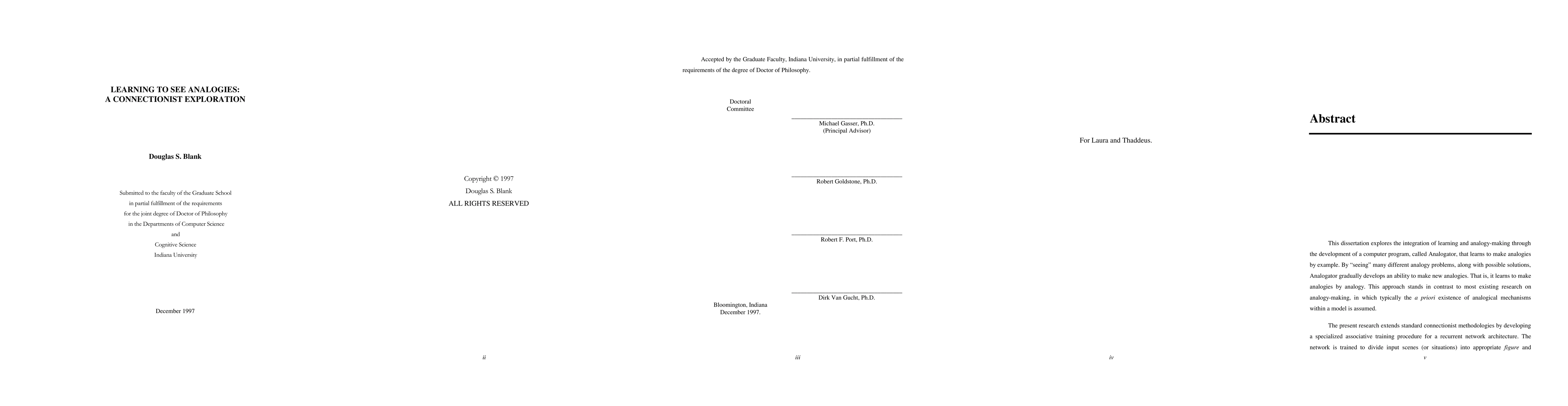 This dissertation explores the integration of learning and analogy-making through the development of a computer program, called Analogator, that learns to make analogies by example. By "seeing" many different analogy problems, along with possible solutions, Analogator gradually develops an ability to make new analogies. That is, it learns to make analogies by analogy. This approach stands in contrast to most existing research on analogy-making, in which typically the a priori existence of analogical mechanisms within a model is assumed. The present research extends standard connectionist methodologies by developing a specialized associative training procedure for a recurrent network architecture. The network is trained to divide input scenes (or situations) into appropriate figure and ground components. Seeing one scene in terms of a particular figure and ground provides the context for seeing another in an analogous fashion. After training, the model is able to make new analogies between novel situations. Analogator has much in common with lower-level perceptual models of categorization and recognition; it thus serves as a unifying framework encompassing both high-level analogical learning and low-level perception. This approach is compared and contrasted with other computational models of analogy-making. The model's training and generalization performance is examined, and limitations are discussed.