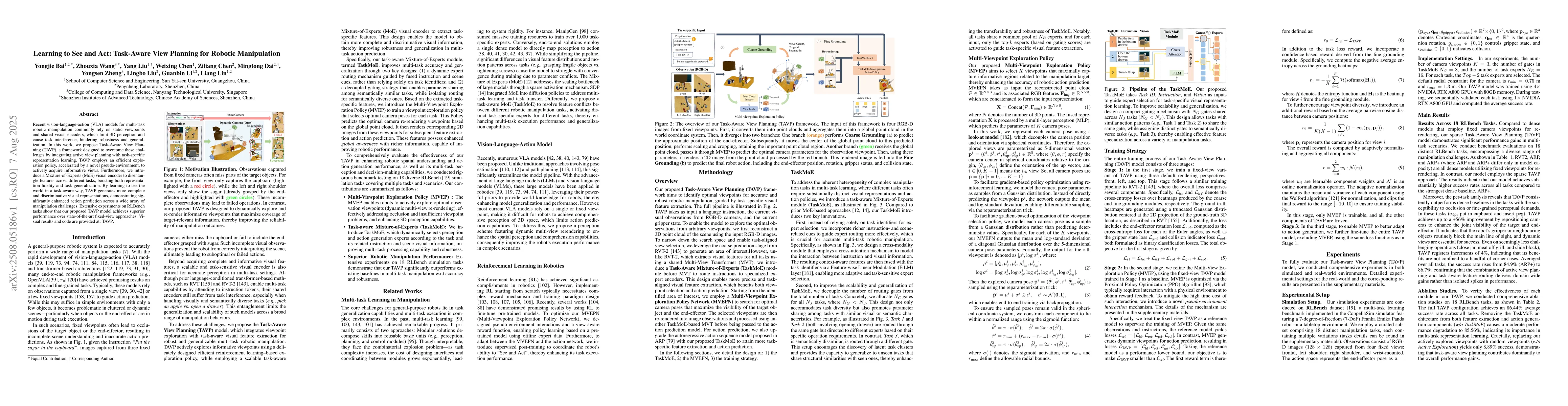 Recent vision-language-action (VLA) models for multi-task robotic manipulation commonly rely on static viewpoints and shared visual encoders, which limit 3D perception and cause task interference, hindering robustness and generalization. In this work, we propose Task-Aware View Planning (TAVP), a framework designed to overcome these challenges by integrating active view planning with task-specific representation learning. TAVP employs an efficient exploration policy, accelerated by a novel pseudo-environment, to actively acquire informative views. Furthermore, we introduce a Mixture-of-Experts (MoE) visual encoder to disentangle features across different tasks, boosting both representation fidelity and task generalization. By learning to see the world in a task-aware way, TAVP generates more complete and discriminative visual representations, demonstrating significantly enhanced action prediction across a wide array of manipulation challenges. Extensive experiments on RLBench tasks show that our proposed TAVP model achieves superior performance over state-of-the-art fixed-view approaches. Visual results and code are provided at: https://hcplab-sysu.github.io/TAVP.
