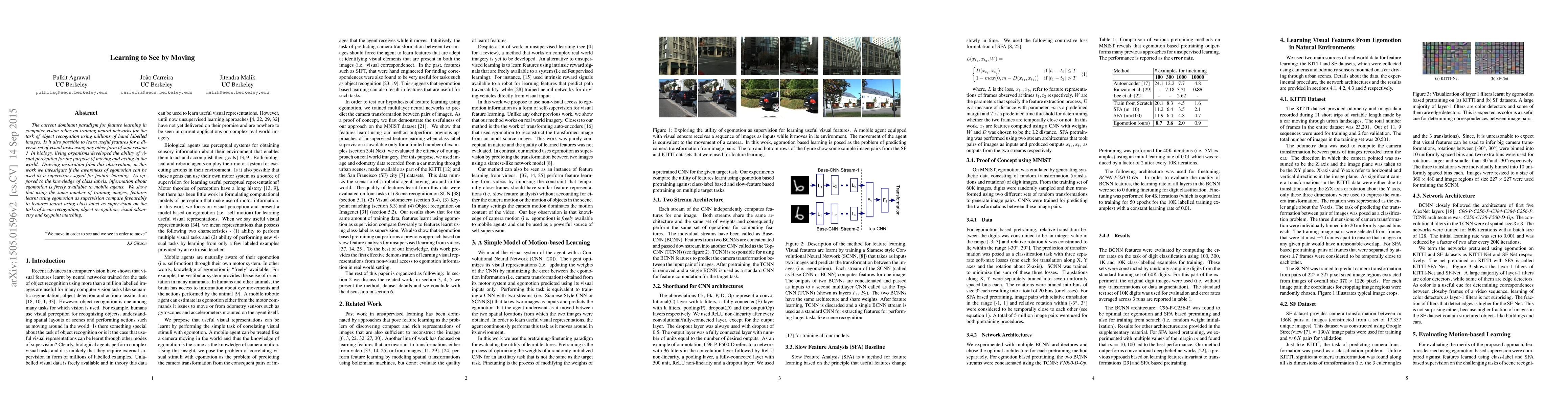 The dominant paradigm for feature learning in computer vision relies on training neural networks for the task of object recognition using millions of hand labelled images. Is it possible to learn useful features for a diverse set of visual tasks using any other form of supervision? In biology, living organisms developed the ability of visual perception for the purpose of moving and acting in the world. Drawing inspiration from this observation, in this work we investigate if the awareness of egomotion can be used as a supervisory signal for feature learning. As opposed to the knowledge of class labels, information about egomotion is freely available to mobile agents. We show that given the same number of training images, features learnt using egomotion as supervision compare favourably to features learnt using class-label as supervision on visual tasks of scene recognition, object recognition, visual odometry and keypoint matching.