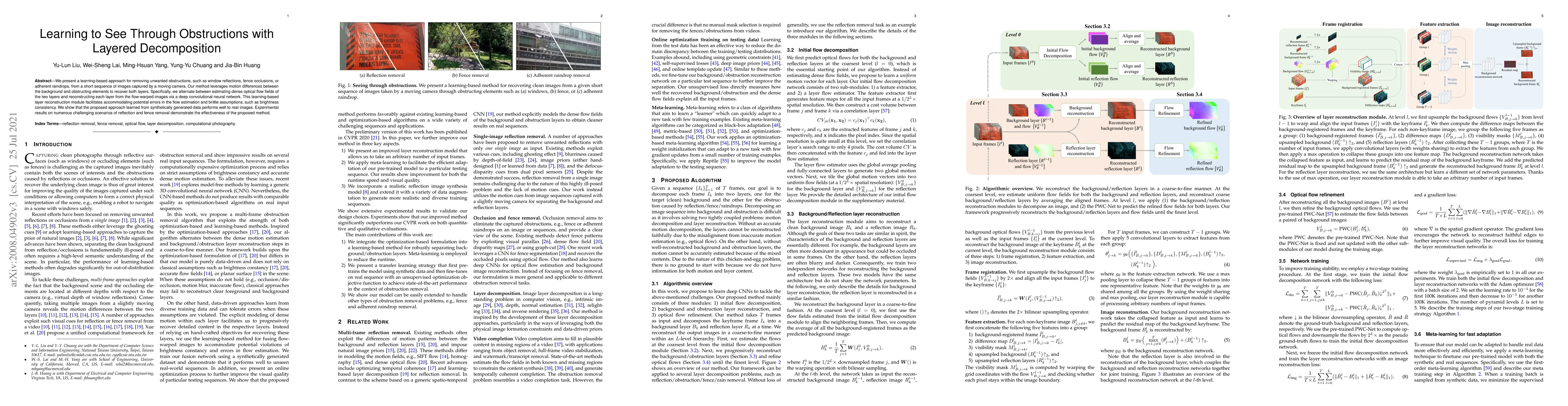 We present a learning-based approach for removing unwanted obstructions, such as window reflections, fence occlusions, or adherent raindrops, from a short sequence of images captured by a moving camera. Our method leverages motion differences between the background and obstructing elements to recover both layers. Specifically, we alternate between estimating dense optical flow fields of the two layers and reconstructing each layer from the flow-warped images via a deep convolutional neural network. This learning-based layer reconstruction module facilitates accommodating potential errors in the flow estimation and brittle assumptions, such as brightness consistency. We show that the proposed approach learned from synthetically generated data performs well to real images. Experimental results on numerous challenging scenarios of reflection and fence removal demonstrate the effectiveness of the proposed method.
