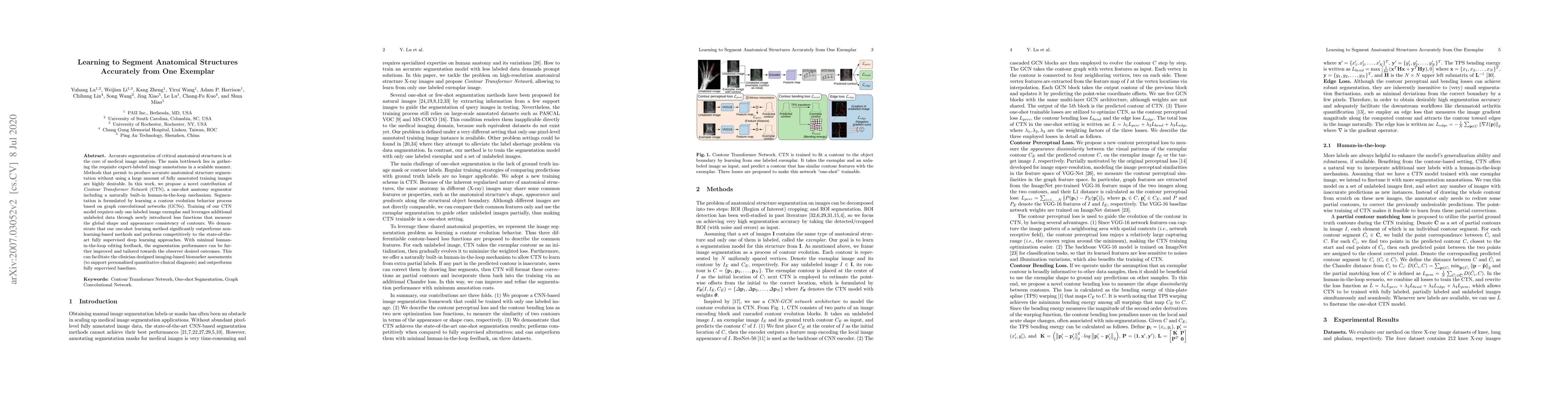 This paper introduces a Contour Transformer Network (CTN) for accurate anatomical structure segmentation using only one labeled exemplar, leveraging graph convolutional networks and human-in-the-loop feedback. This one-shot learning approach outperforms non-learning methods and is competitive with fully supervised deep learning, facilitating personalized clinical diagnosis.