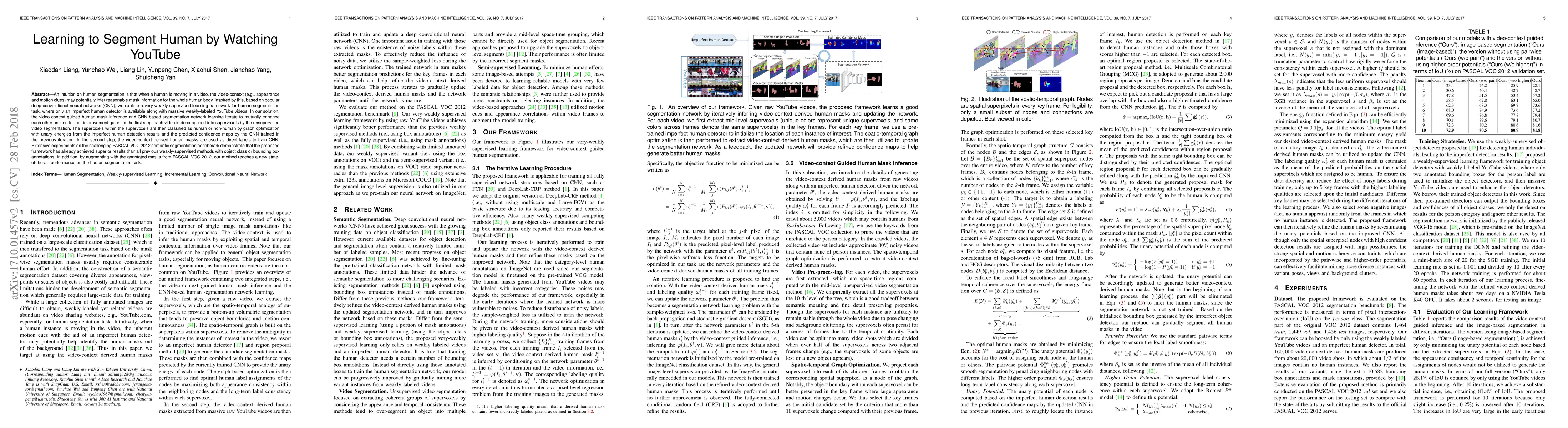 This paper proposes a very-weakly supervised learning framework for human segmentation using deep convolutional neural networks (CNNs) and massive YouTube video data. The method iteratively refines human masks using video-context clues and CNN-based segmentation, achieving superior results on the PASCAL VOC 2012 benchmark compared to previous weakly-supervised methods.