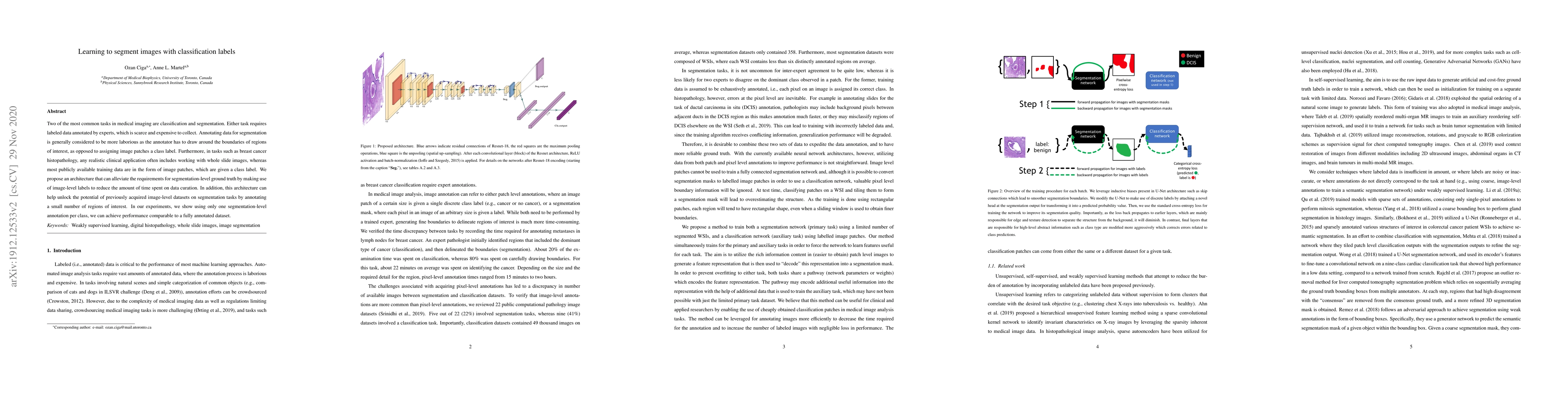 Two of the most common tasks in medical imaging are classification and segmentation. Either task requires labeled data annotated by experts, which is scarce and expensive to collect. Annotating data for segmentation is generally considered to be more laborious as the annotator has to draw around the boundaries of regions of interest, as opposed to assigning image patches a class label. Furthermore, in tasks such as breast cancer histopathology, any realistic clinical application often includes working with whole slide images, whereas most publicly available training data are in the form of image patches, which are given a class label. We propose an architecture that can alleviate the requirements for segmentation-level ground truth by making use of image-level labels to reduce the amount of time spent on data curation. In addition, this architecture can help unlock the potential of previously acquired image-level datasets on segmentation tasks by annotating a small number of regions of interest. In our experiments, we show using only one segmentation-level annotation per class, we can achieve performance comparable to a fully annotated dataset.