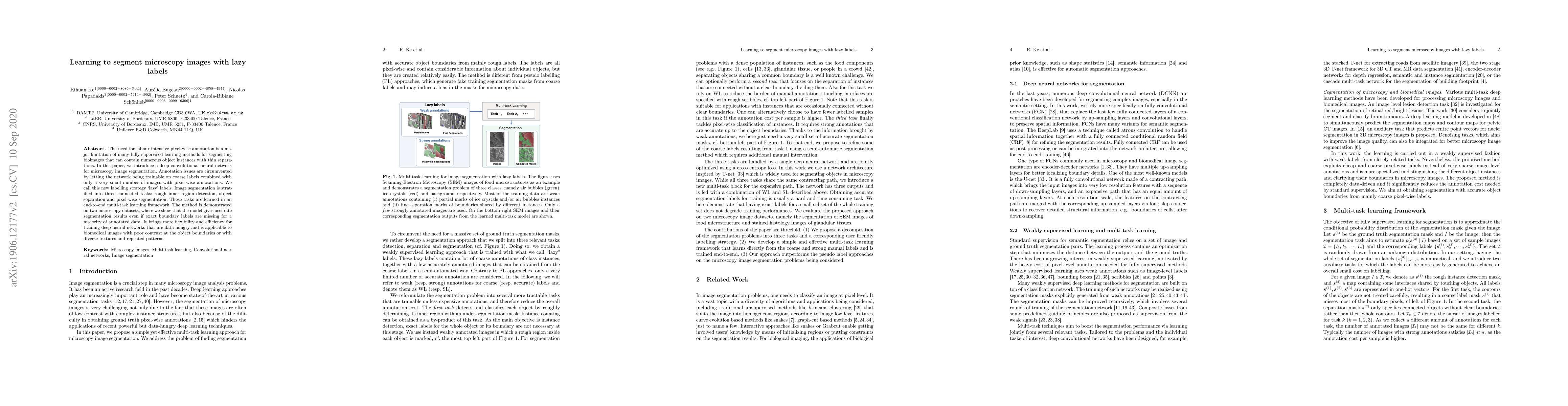 The need for labour intensive pixel-wise annotation is a major limitation of many fully supervised learning methods for segmenting bioimages that can contain numerous object instances with thin separations. In this paper, we introduce a deep convolutional neural network for microscopy image segmentation. Annotation issues are circumvented by letting the network being trainable on coarse labels combined with only a very small number of images with pixel-wise annotations. We call this new labelling strategy `lazy' labels. Image segmentation is stratified into three connected tasks: rough inner region detection, object separation and pixel-wise segmentation. These tasks are learned in an end-to-end multi-task learning framework. The method is demonstrated on two microscopy datasets, where we show that the model gives accurate segmentation results even if exact boundary labels are missing for a majority of annotated data. It brings more flexibility and efficiency for training deep neural networks that are data hungry and is applicable to biomedical images with poor contrast at the object boundaries or with diverse textures and repeated patterns.